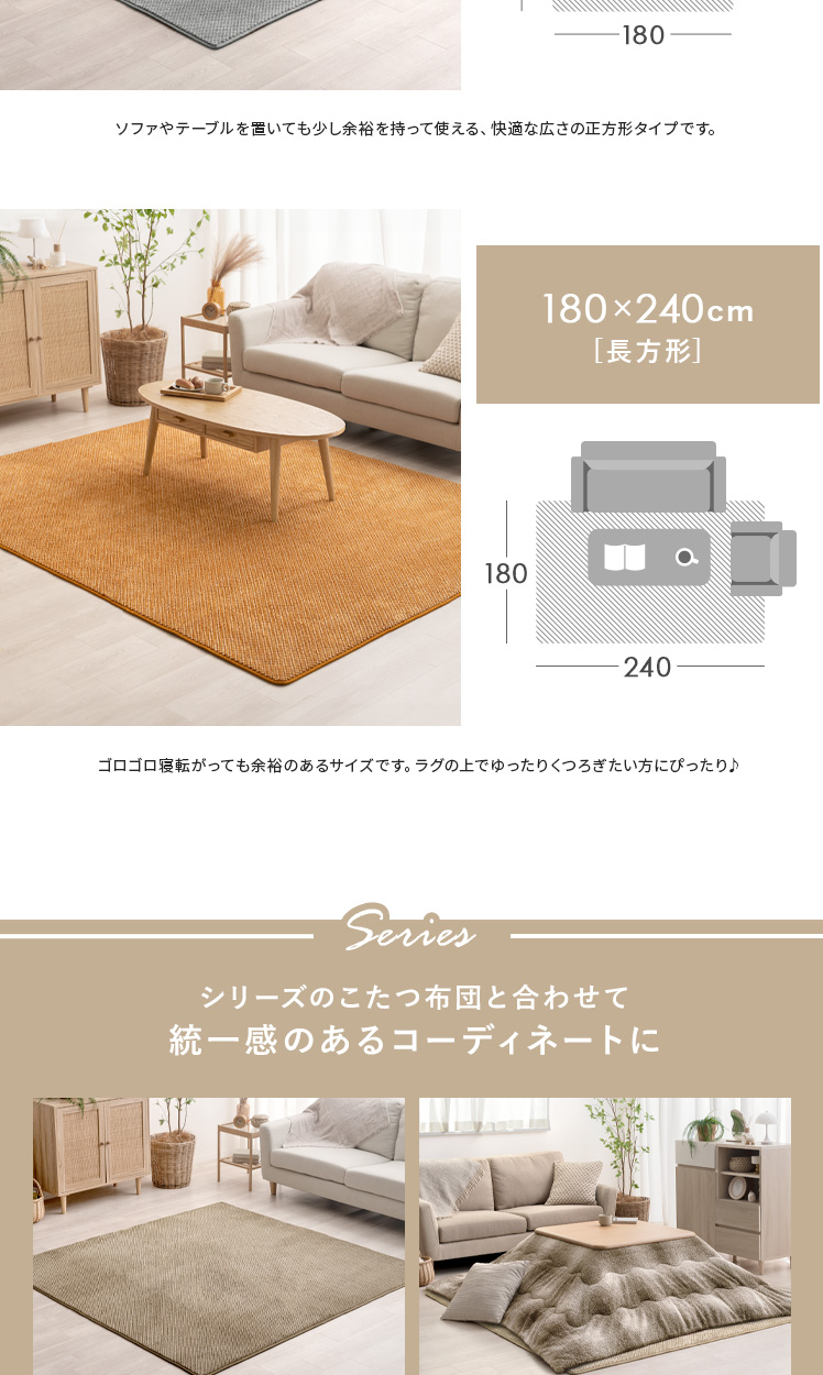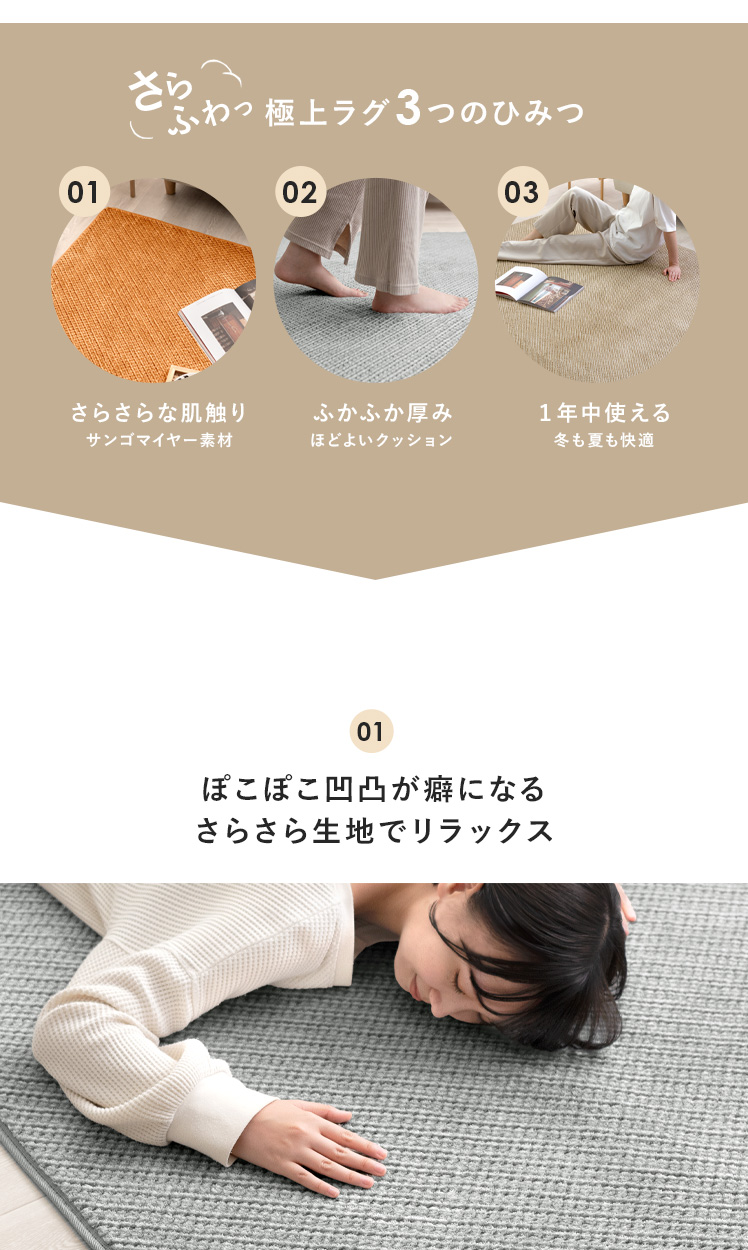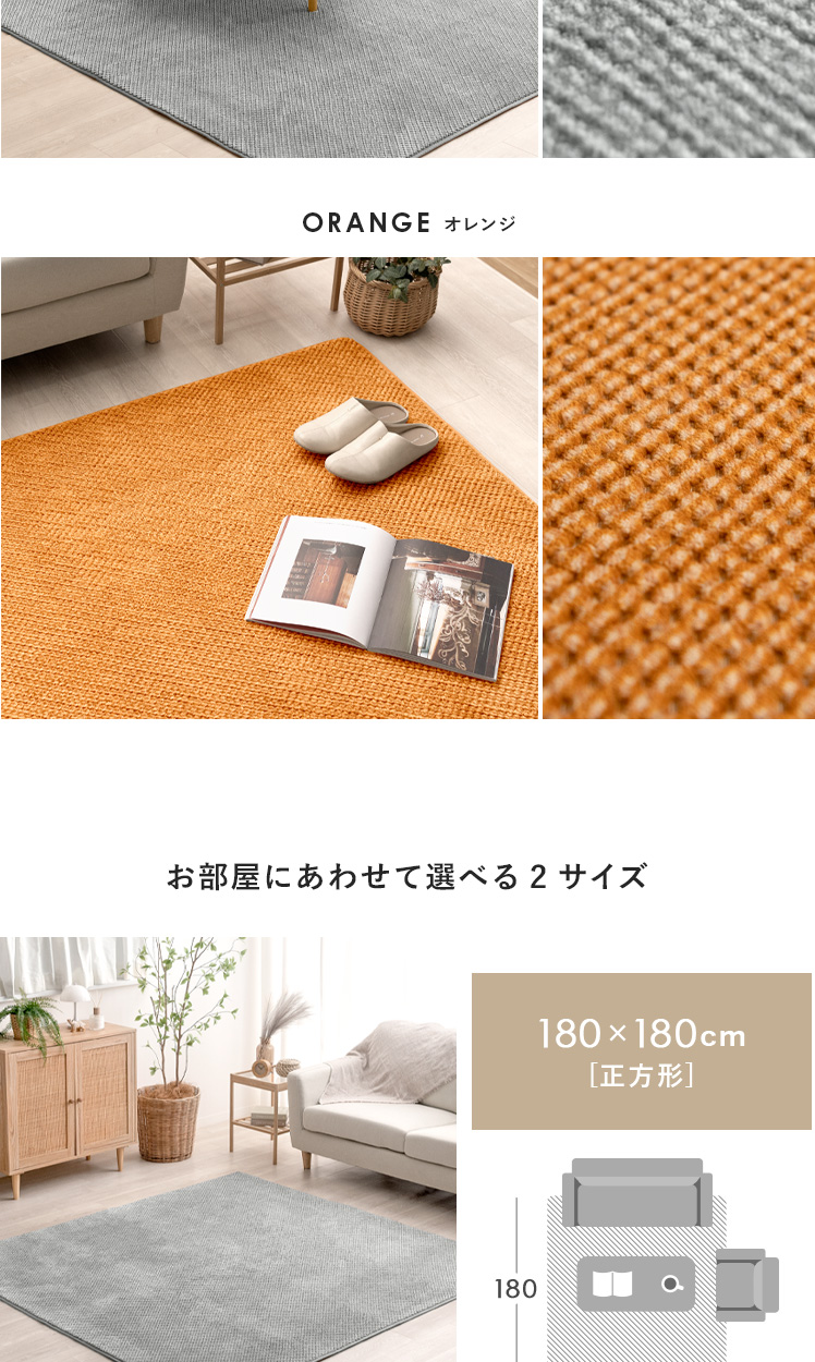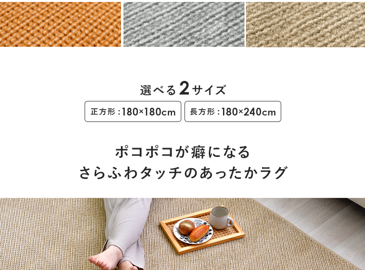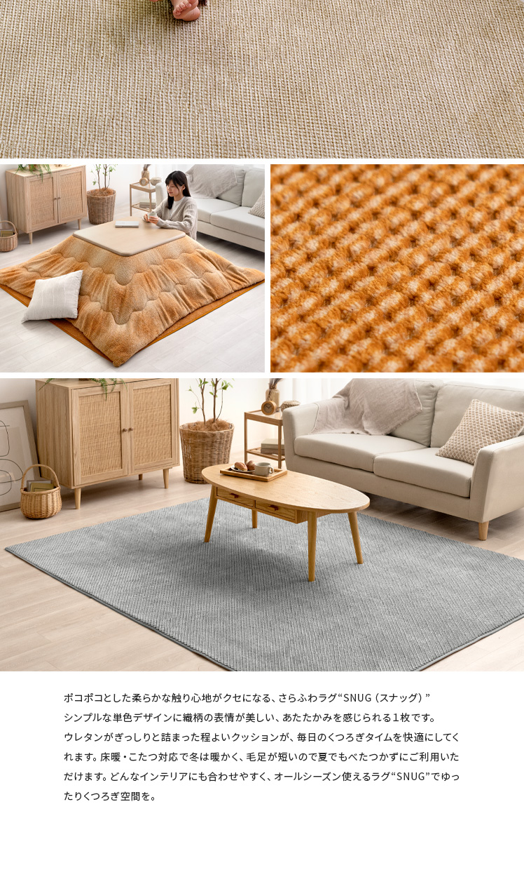 ラグ・こたつ敷布団 Snug〔スナッグ〕180×180cm 正方形/ポコポコとした柔らかな触り心地がクセになる、さらふわラグ“SNUG(スナッグ)”シンプルな単色デザインに織柄の表情が美しい、あたたかみを感じられる1枚です。ウレタンがぎっしりと詰まった程よいクッションが、毎日のくつろぎタイムを快適にしてくれます。床暖・こたつ対応で冬は暖かく、毛足が短いので夏でもべたつかずにご利用いただけます。どんなインテリアにも合わせやすく、オールシーズン使えるラグ“SNUG”でゆったりくつろぎ空間を。