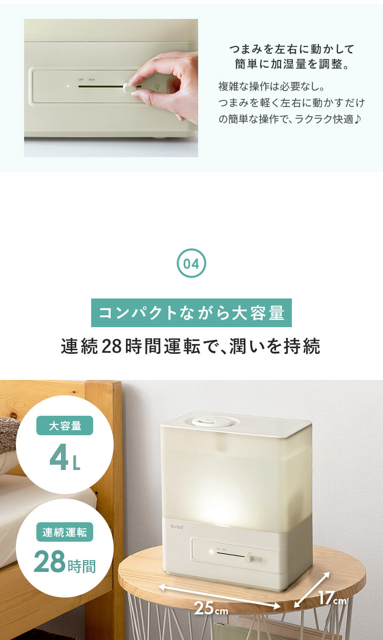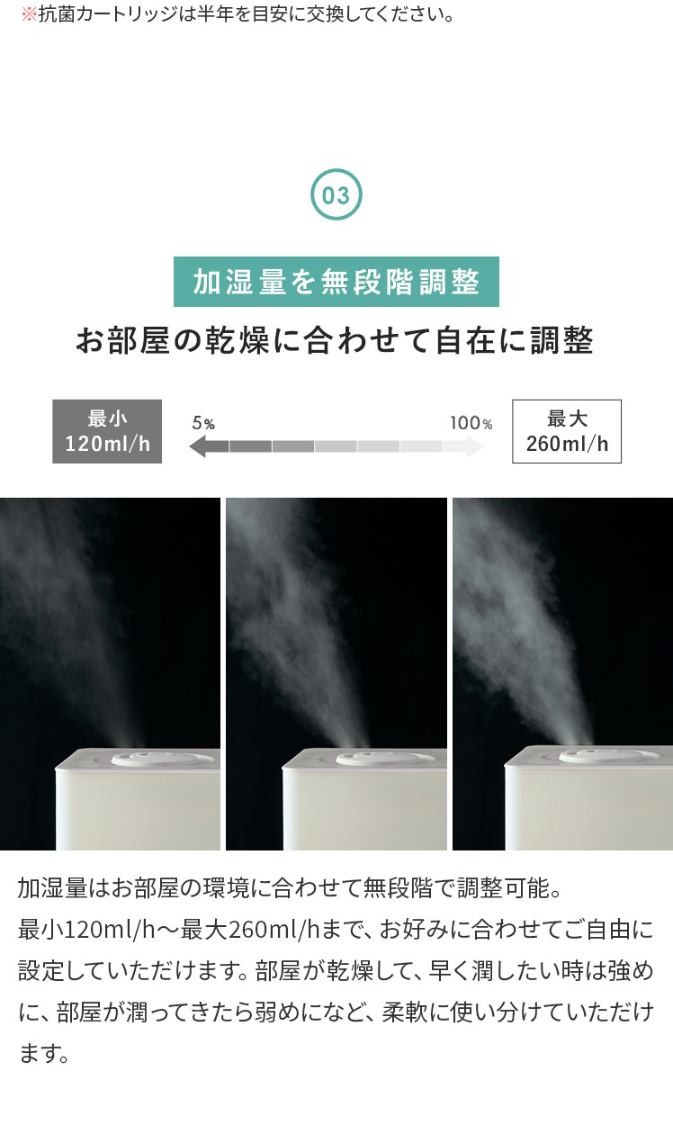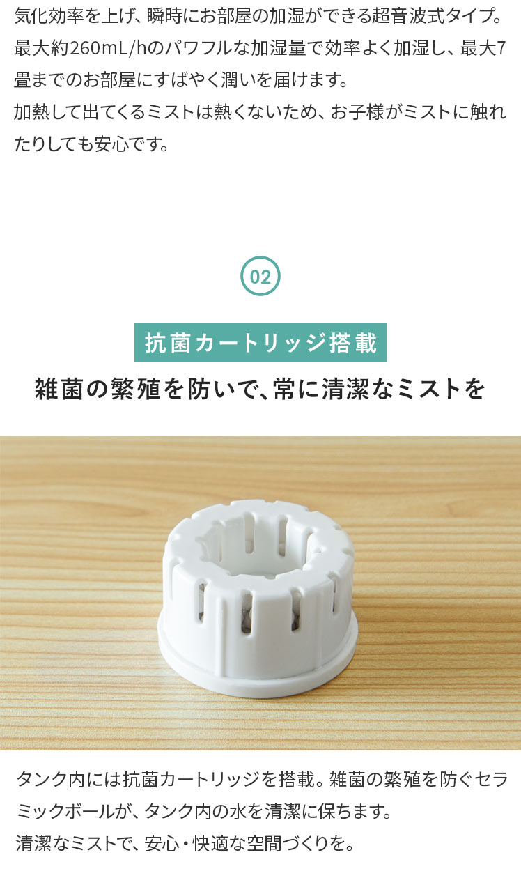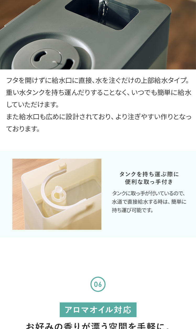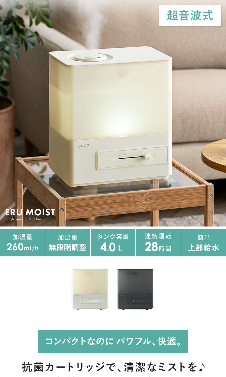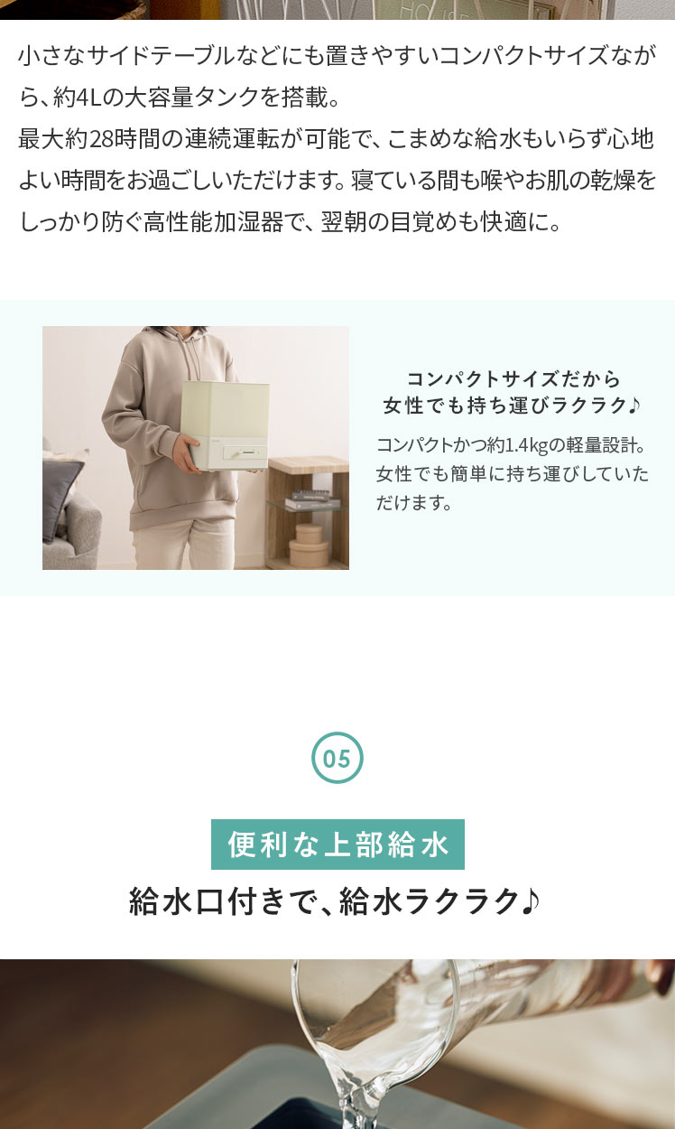上部給水 タンク容量4L 洋室7畳 加湿量260ml/h 連続28時間 アロマ対応 抗菌 コンパクト 無段階調整 簡単給水 タイマー機能付き アイボリー グレー ◇