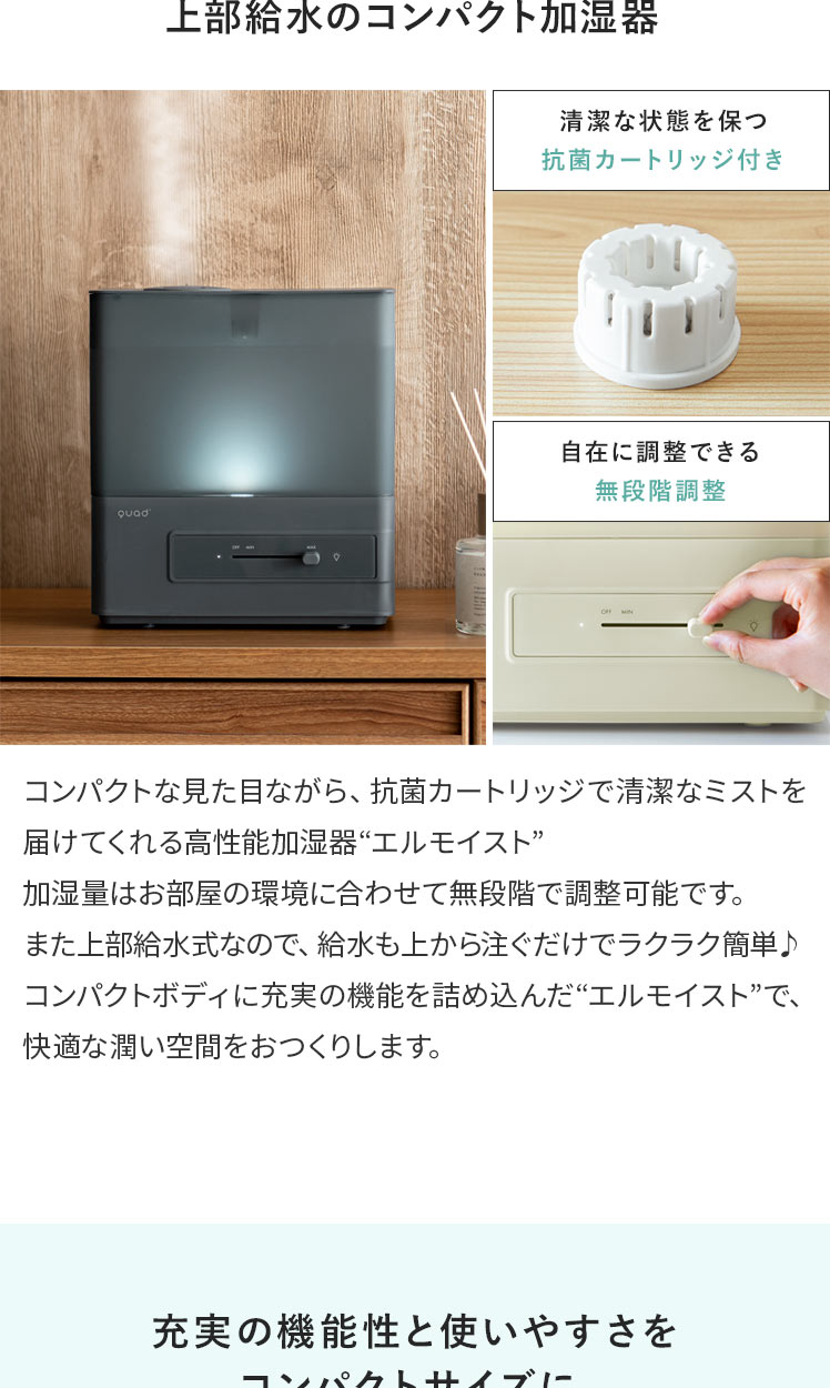 上部給水超音波式加湿器 ERUMOIST〔エルモイスト〕/コンパクトな見た目ながら、抗菌カートリッジで清潔なミストを届けてくれる高性能加湿器“エルモイスト”加湿量はお部屋の環境に合わせて無段階で調整可能です。また上部給水式なので、給水も上から注ぐだけでラクラク簡単♪コンパクトボディに充実の機能を詰め込んだ“エルモイスト”で、快適な潤い空間をおつくりします。