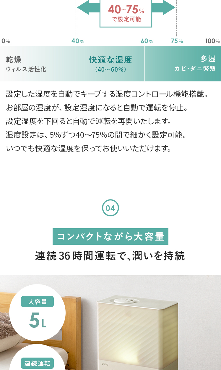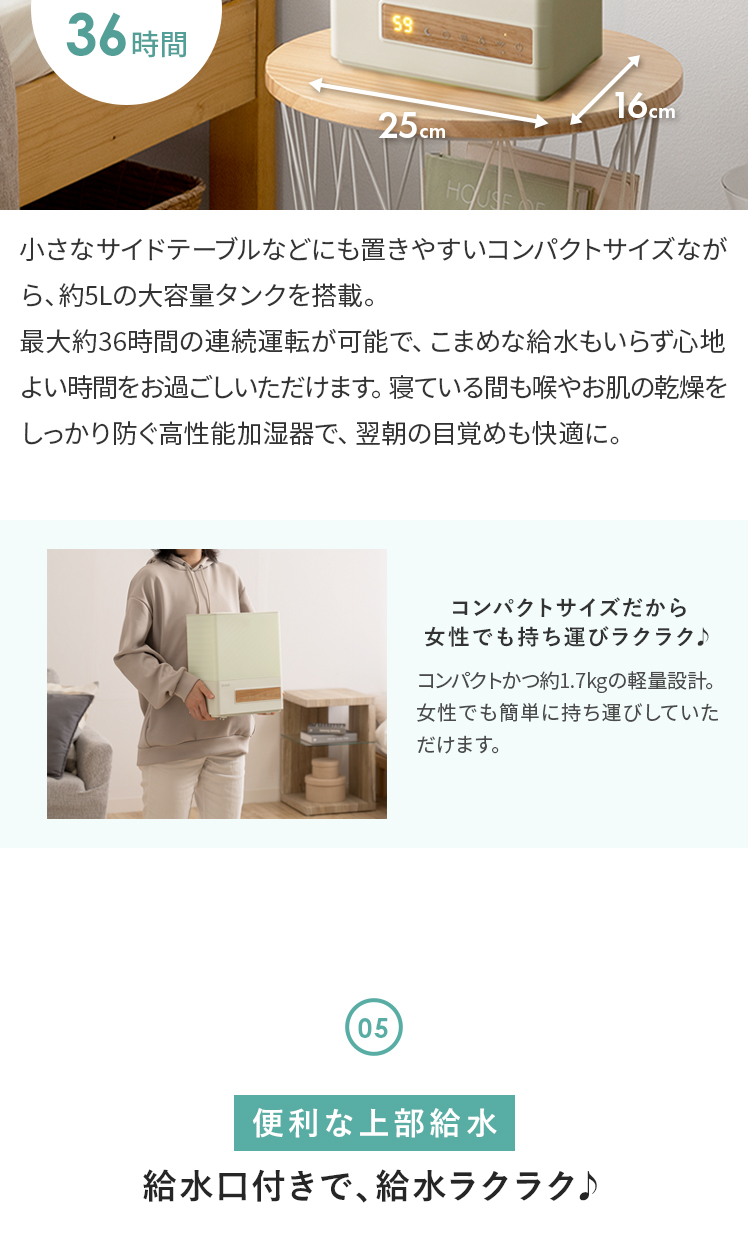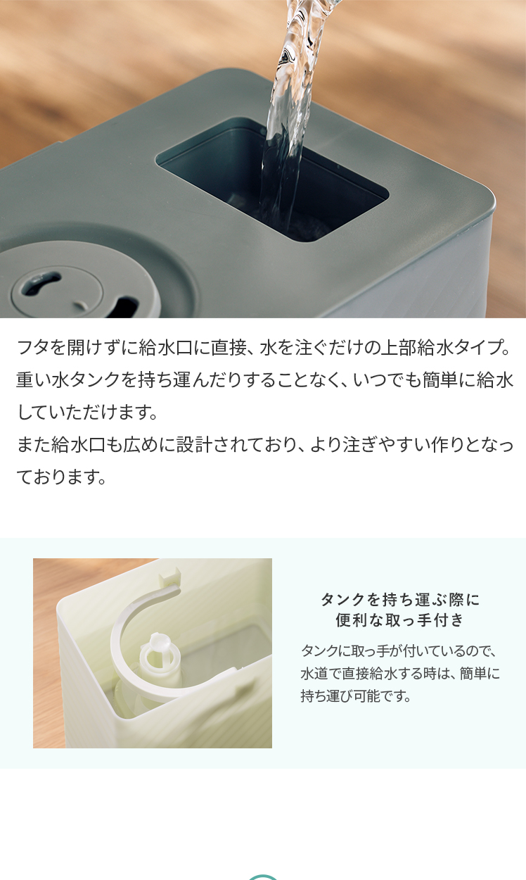 上部給水 タンク容量5L 洋室14畳 加湿量500ml/h 連続36時間