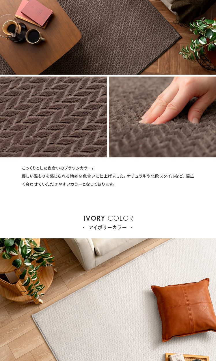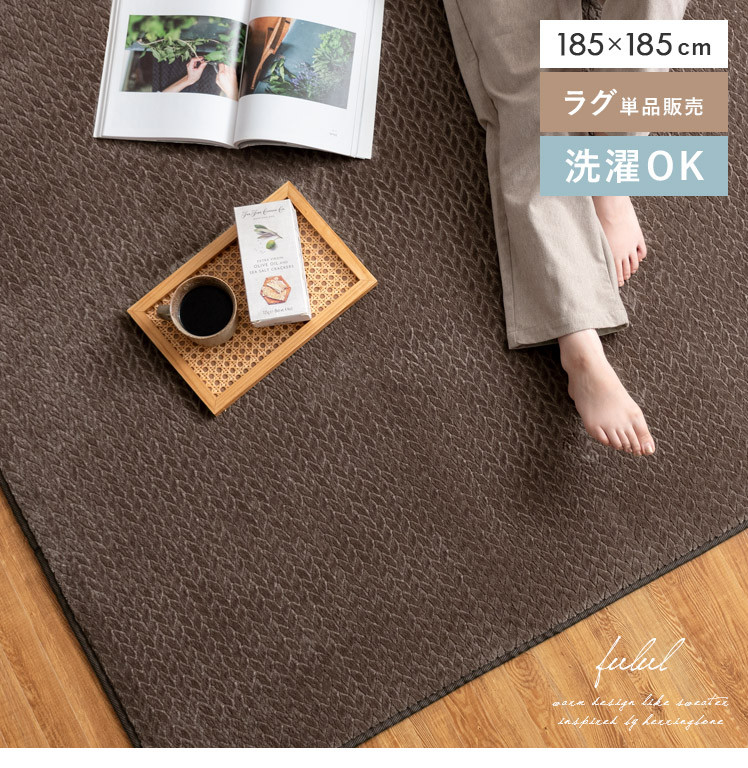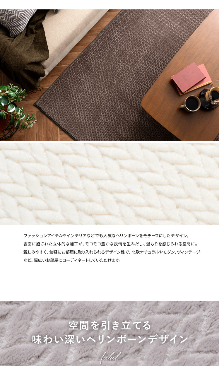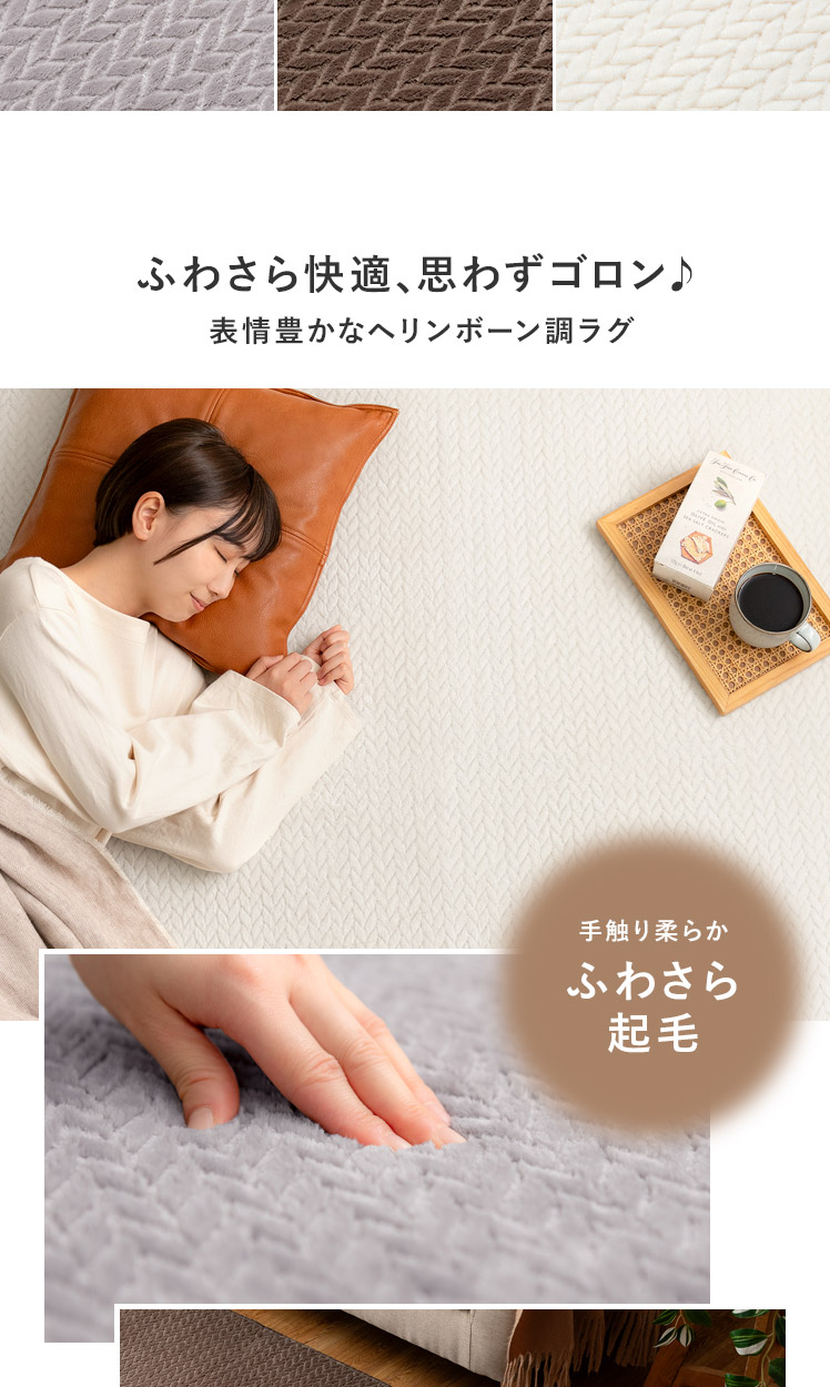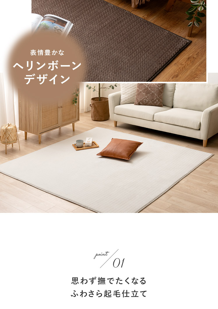 ヘリンボーン調ラグ Fulul〔フルル〕185×185cm/ファッションアイテムやインテリアでも人気なヘリンボーンをモチーフにしたデザインが、親しみやすく温もりある雰囲気をお部屋を演出するラグ"Fulul(フルル)"生地に立体的な加工を施した、ふわさら柔らかな肌触りが気持ち良い起毛仕立て。繊維の細い柔らかな生地をぎっしり高密度に織り上げ、素肌で撫でたくなるほどふわふわに♪一度触れるとやみつきになる感触です。また、短めの毛足で仕上げており、夏はサラッとベタつきにくく冬はぽかぽか暖かく、一年中快適にお過ごしいただけます。