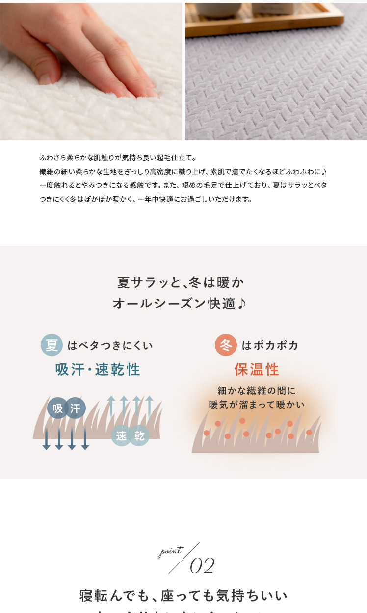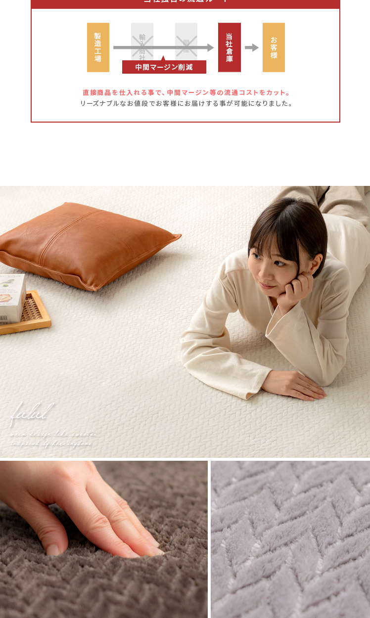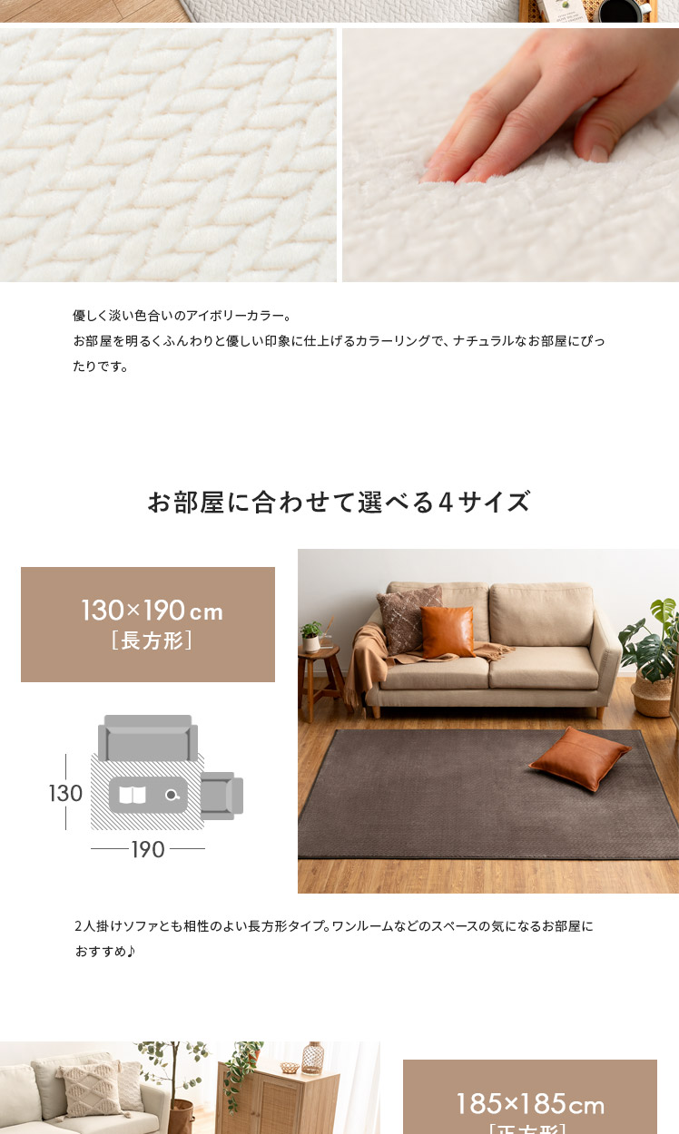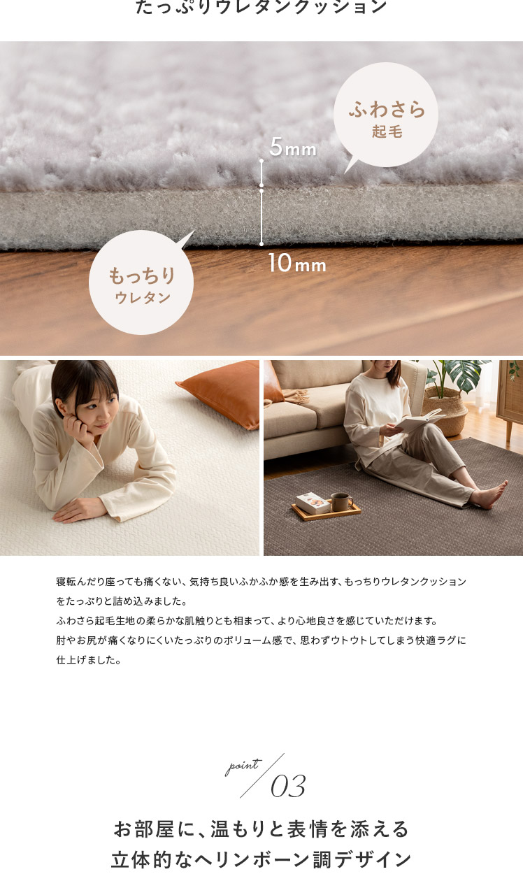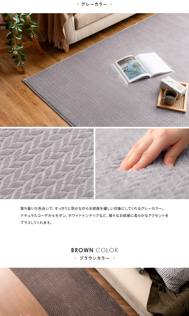 ヘリンボーン調ラグ Fulul〔フルル〕185×185cm/ファッションアイテムやインテリアでも人気なヘリンボーンをモチーフにしたデザインが、親しみやすく温もりある雰囲気をお部屋を演出するラグ"Fulul(フルル)"生地に立体的な加工を施した、ふわさら柔らかな肌触りが気持ち良い起毛仕立て。繊維の細い柔らかな生地をぎっしり高密度に織り上げ、素肌で撫でたくなるほどふわふわに♪一度触れるとやみつきになる感触です。また、短めの毛足で仕上げており、夏はサラッとベタつきにくく冬はぽかぽか暖かく、一年中快適にお過ごしいただけます。