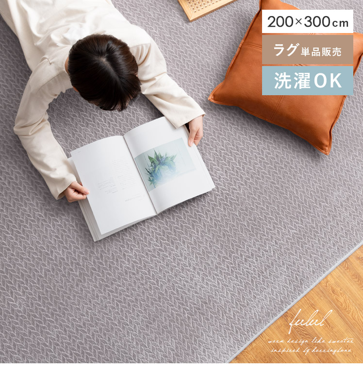 ヘリンボーン調ラグ Fulul〔フルル〕200×300cm/ファッションアイテムやインテリアでも人気なヘリンボーンをモチーフにしたデザインが、親しみやすく温もりある雰囲気をお部屋を演出するラグ"Fulul(フルル)"生地に立体的な加工を施した、ふわさら柔らかな肌触りが気持ち良い起毛仕立て。繊維の細い柔らかな生地をぎっしり高密度に織り上げ、素肌で撫でたくなるほどふわふわに♪一度触れるとやみつきになる感触です。また、短めの毛足で仕上げており、夏はサラッとベタつきにくく冬はぽかぽか暖かく、一年中快適にお過ごしいただけます。