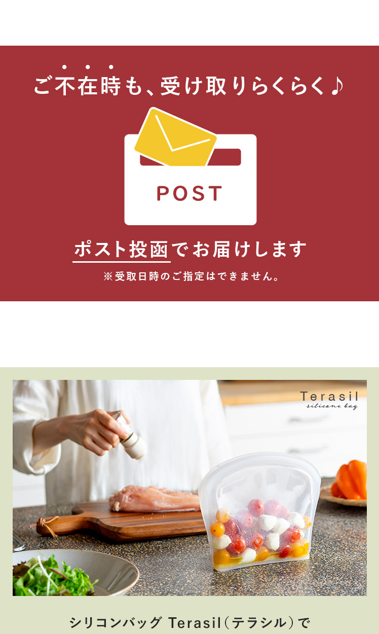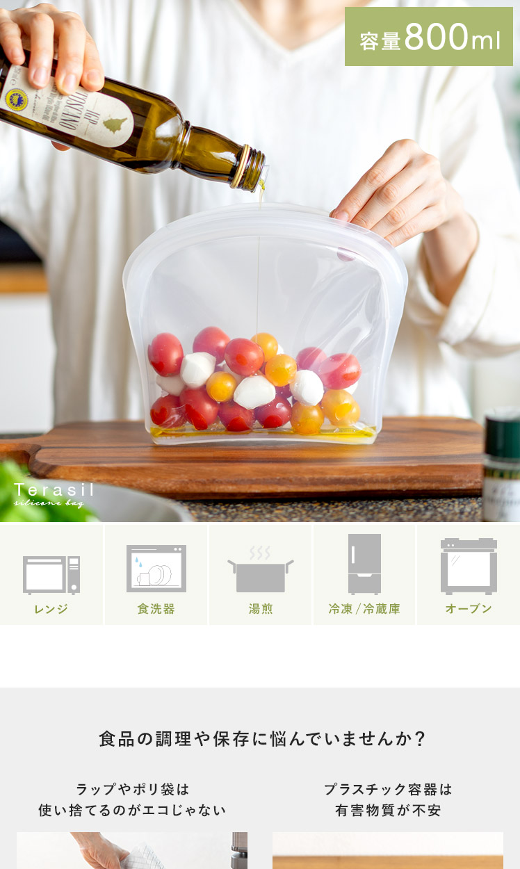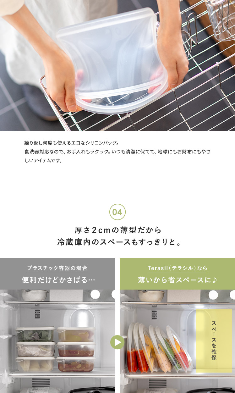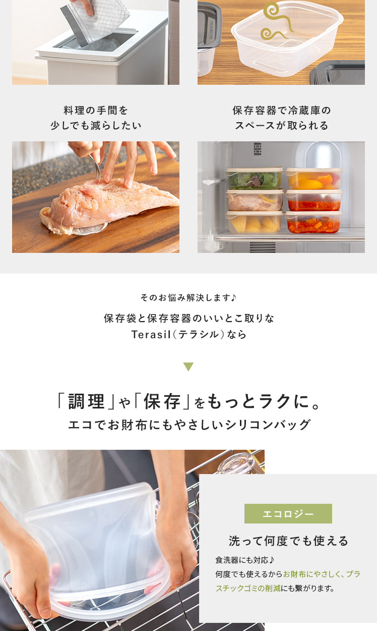 シリコンバッグTerasil〔テラシル〕/食品の調理や保存でお困りではありませんか? ラップやポリ袋は使い捨てでエコじゃないし、プラスチック容器は有害物質が気になる…。