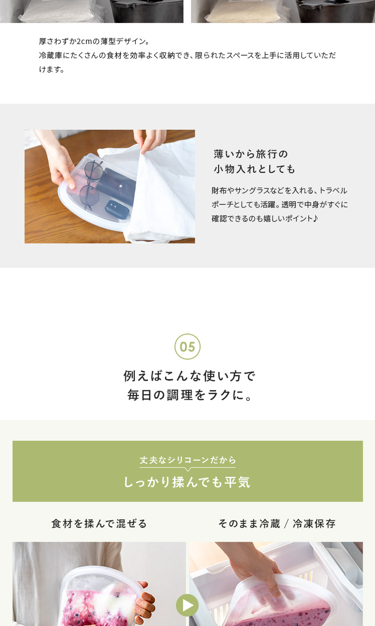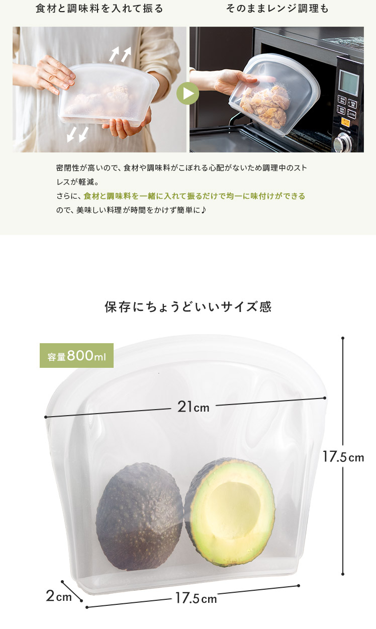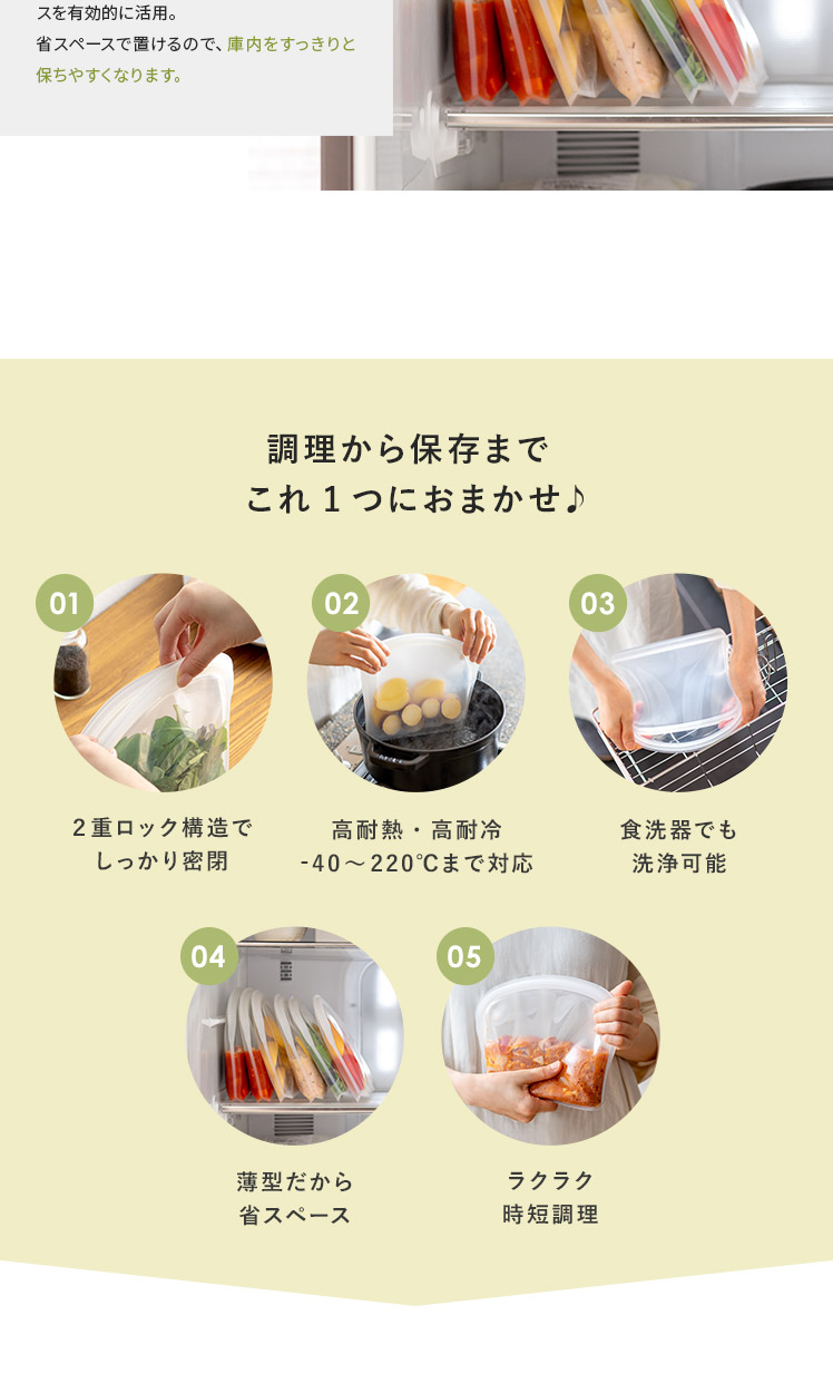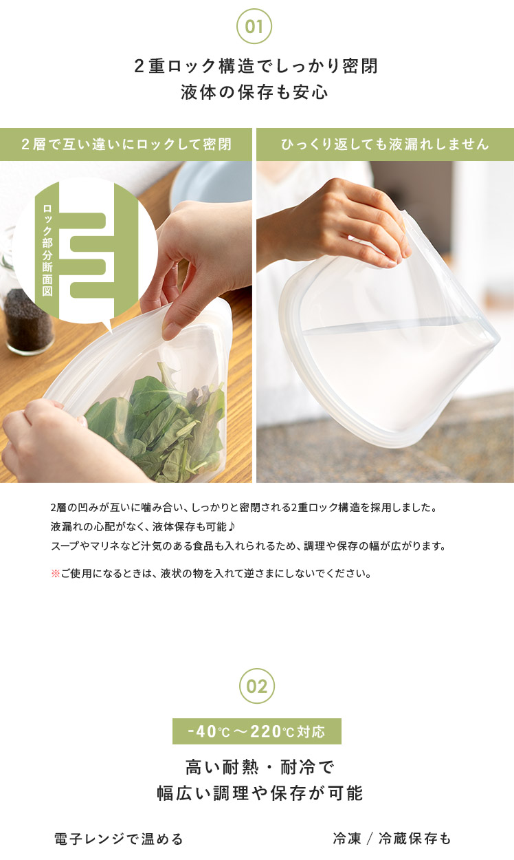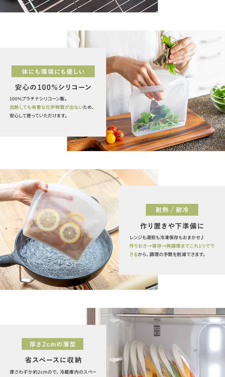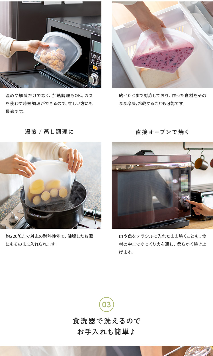 食品保存袋として冷凍・冷蔵に対応し、繰り返し使えるのでエコで経済的♪シリコーン製だから耐久性も抜群で、電子レンジや湯せんでの調理にも対応します。