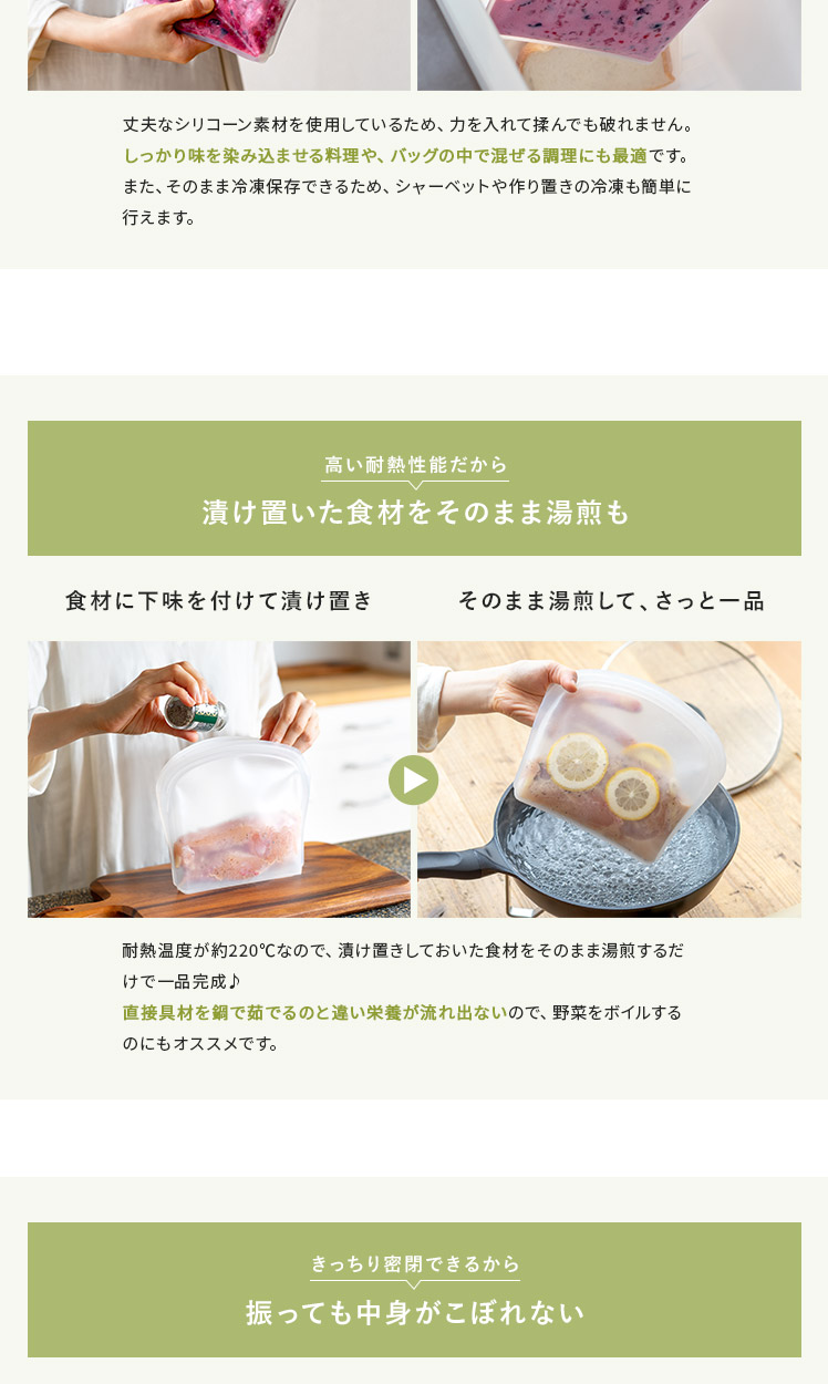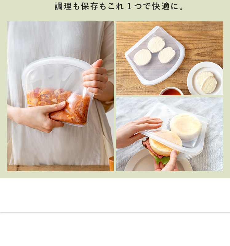 保存袋と保存容器のいいとこ取りをしたこのシリコンバッグなら、「使い捨てを減らしたい」「冷蔵庫をスッキリさせたい」「調理をもっとラクにしたい」そんなお悩みをまるごと解決します♪