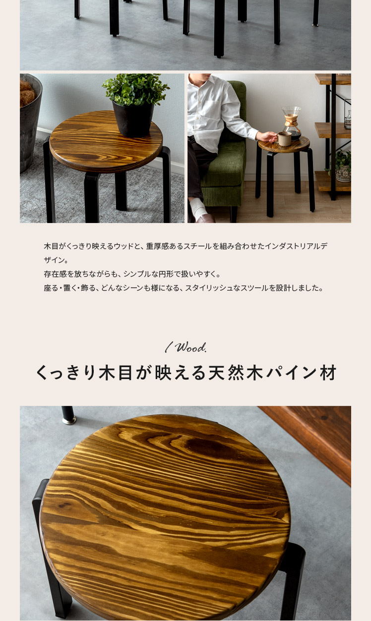 天然木ヴィンテージスツールLewis〔ルイス〕 1脚単体販売/木目がくっきり映えるウッドと、重厚感あるスチールを組み合わせたインダストリアルデザイン。存在感を放ちながらも、シンプルな円形で扱いやすく。座る・置く・飾る、どんなシーンも様になる、スタイリッシュなスツールを設計しました。