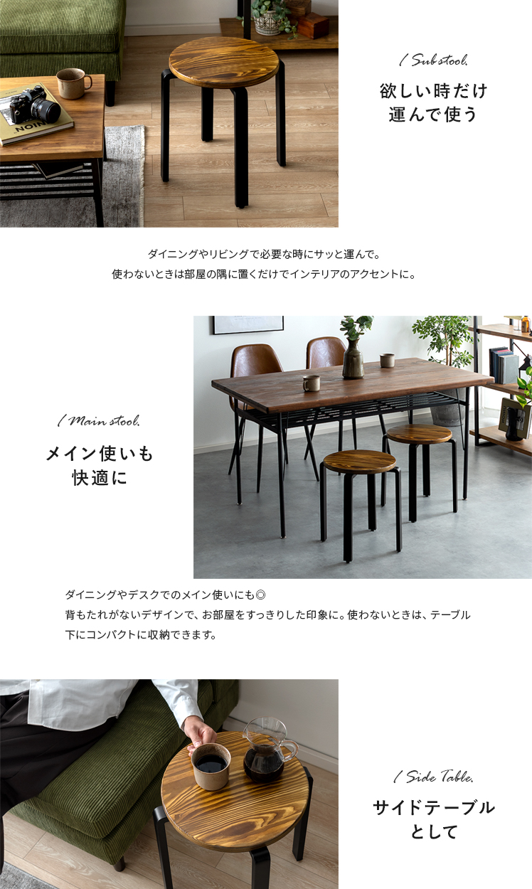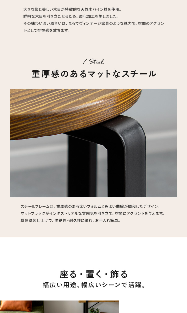 ウッド 丸形 リビング サイドテーブル 天然木 パイン材 炭化