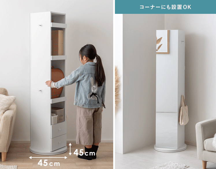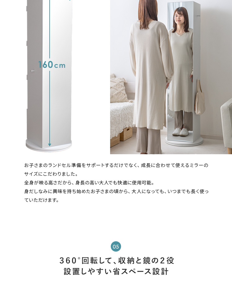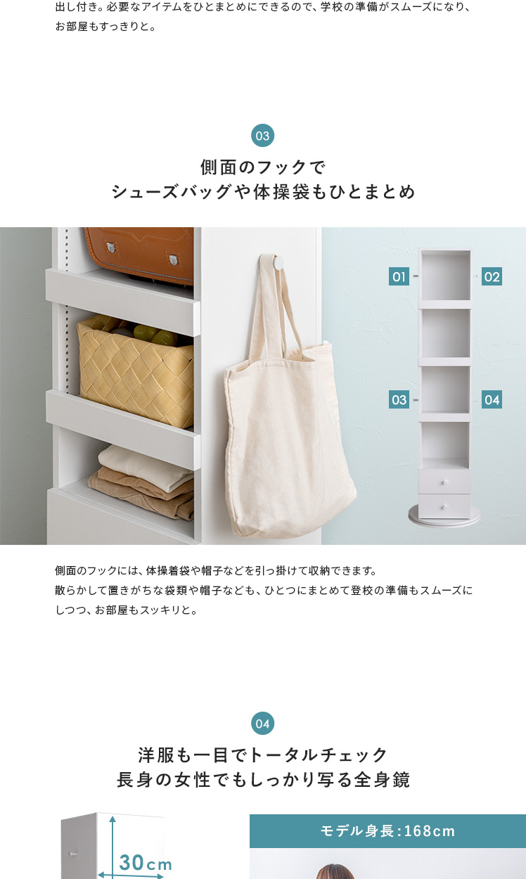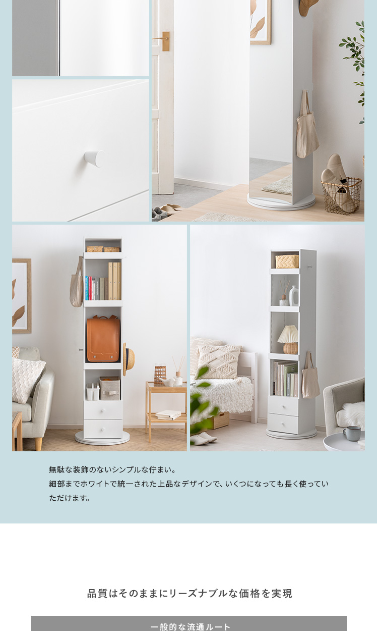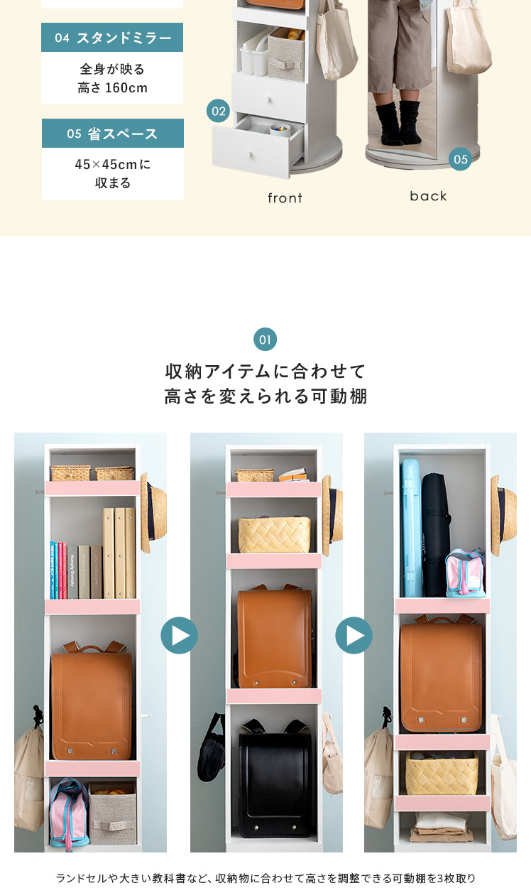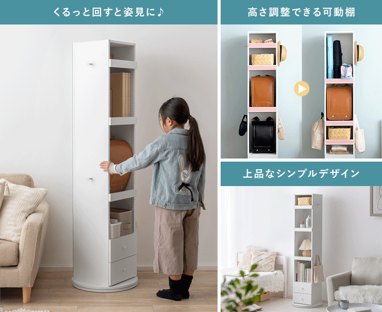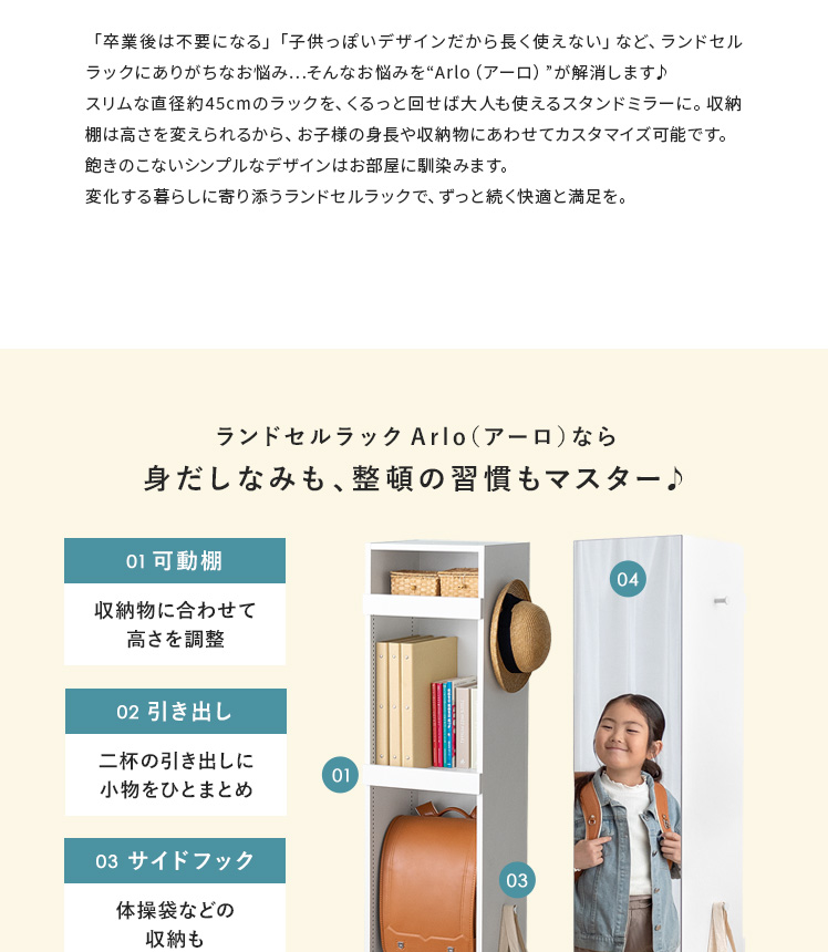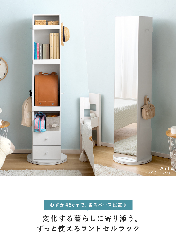 鏡付きランドセルラック Arlo〔アーロ〕/「卒業後は不要になる」「子供っぽいデザインだから長く使えない」など、ランドセルラックにありがちなお悩み…そんなお悩みを“Arlo(アーロ)”が解消します♪スリムな直径約45cmのラックを、くるっと回せば大人も使えるスタンドミラーに。収納棚は高さを変えられるから、お子様の身長や収納物にあわせてカスタマイズ可能です。飽きのこないシンプルなデザインはお部屋に馴染みます。変化する暮らしに寄り添うランドセルラックで、ずっと続く快適と満足を。