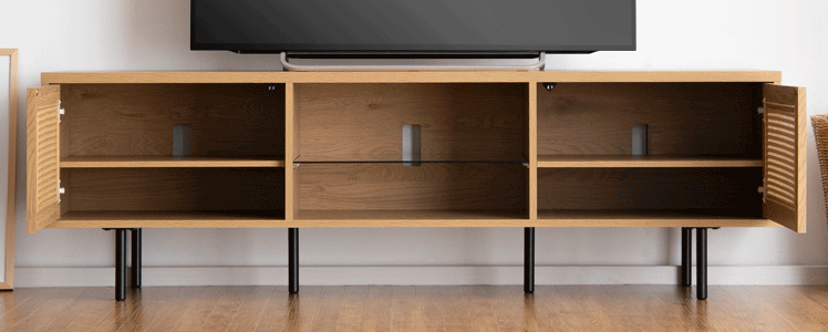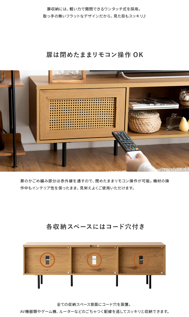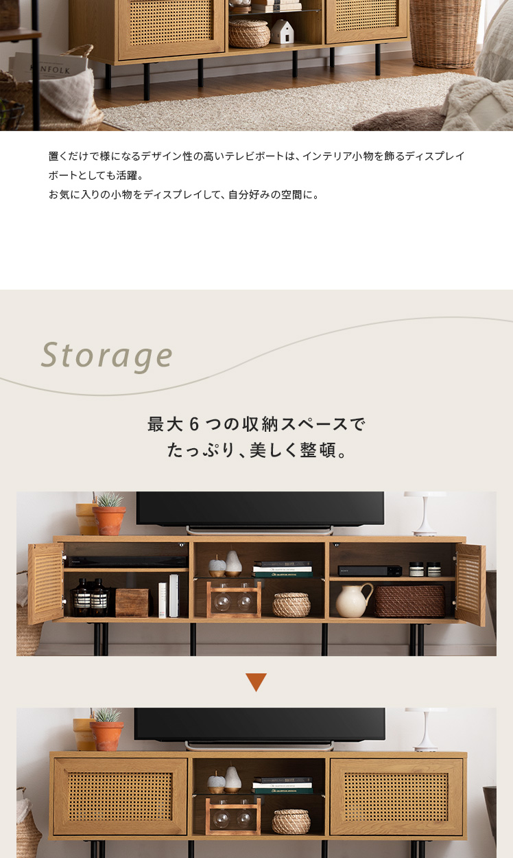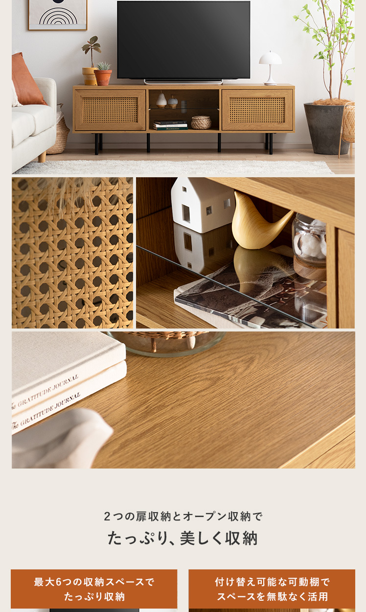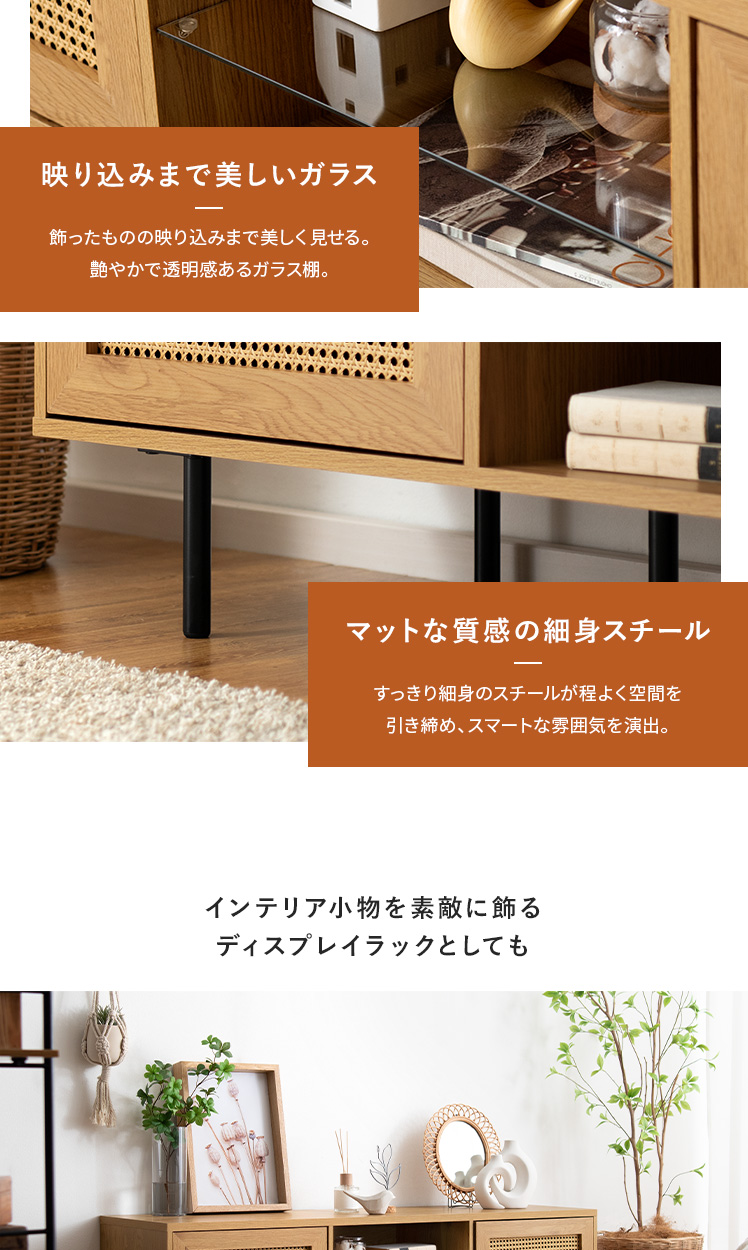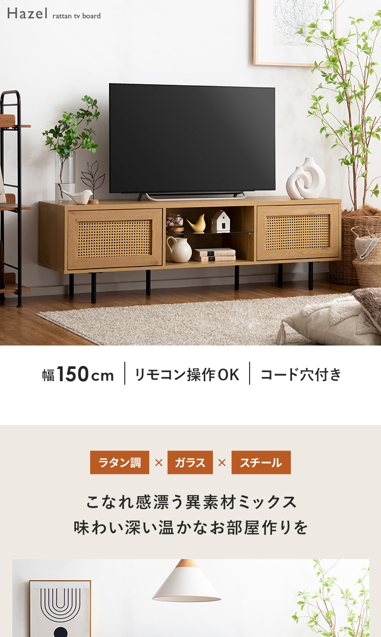 ラタンテレビ台 Hazel〔ヘイゼル〕/異素材を組み合わせた、こなれ感漂う雰囲気の"ラタンテレビ台 Hazel(ヘイゼル)”肌触りまでリアルな木目調をメインに、丁寧に編み込まれたラタンやガラス棚、スチールが合わさり味わい深さを演出します。最大6つの収納スペースが、配線機器やリビング小物をたっぷり整頓。温かで味わい深いテレビ台で、美しく使い勝手の良いリビング空間に。