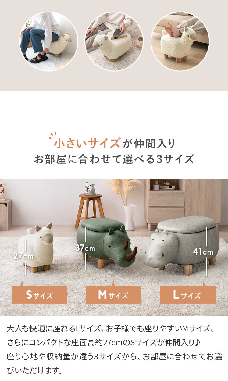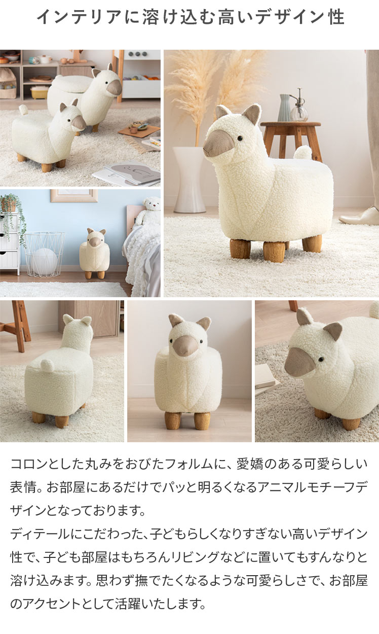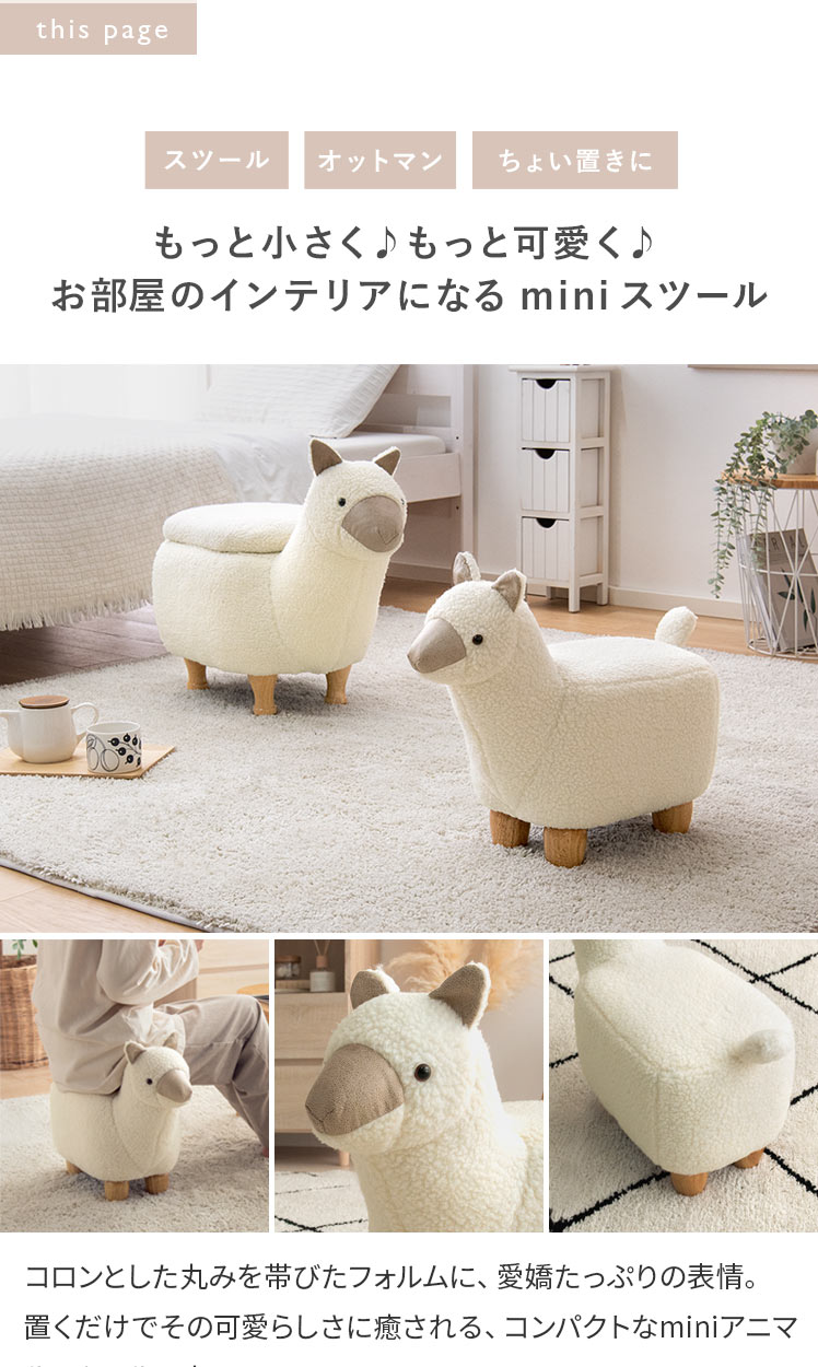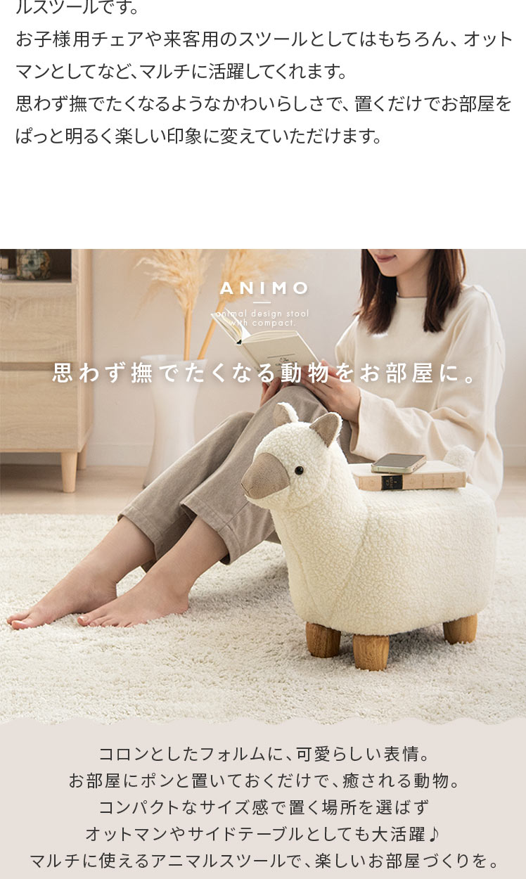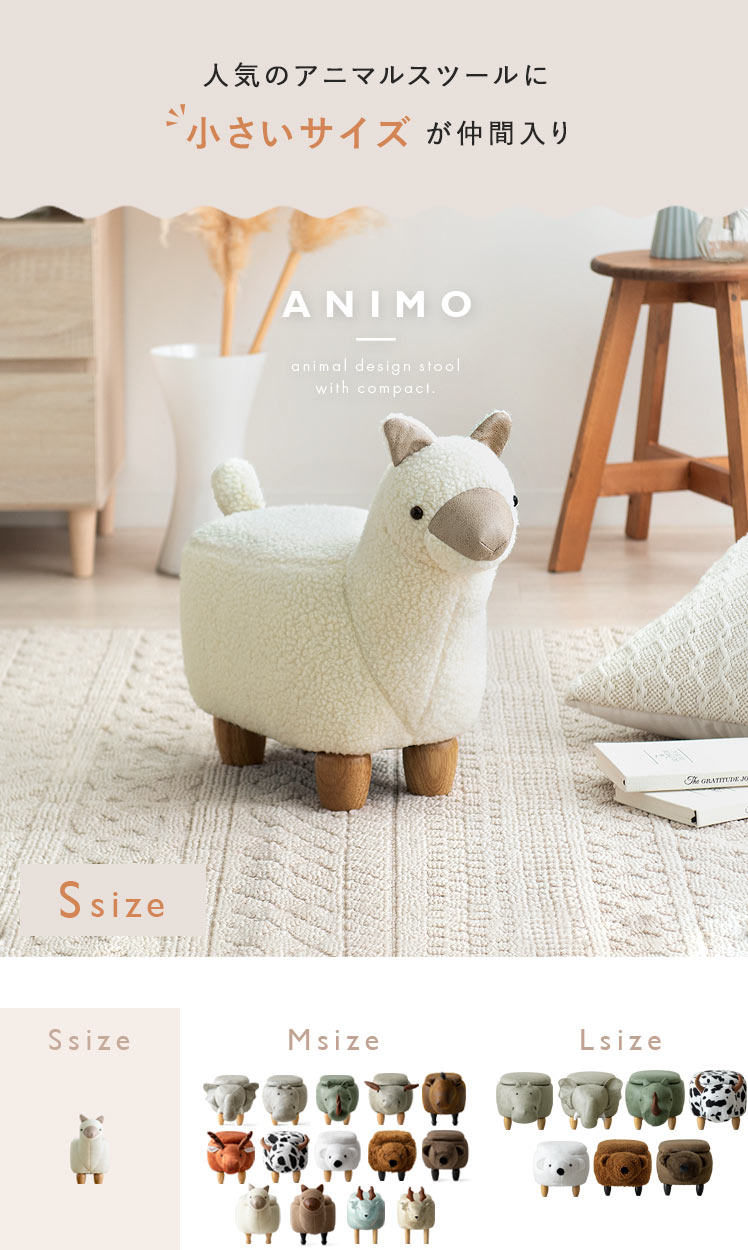 アニマルスツール ANIMO〔アニモ〕 Sサイズ/コロンとした丸みを帯びたフォルムに、愛嬌たっぷりの表情。置くだけでその可愛らしさに癒される、コンパクトなminiアニマルスツールです。お子様用チェアや来客用のスツールとしてはもちろん、オットマンとしてなど、マルチに活躍してくれます。思わず撫でたくなるようなかわいらしさで、置くだけでお部屋をぱっと明るく楽しい印象に変えていただけます。