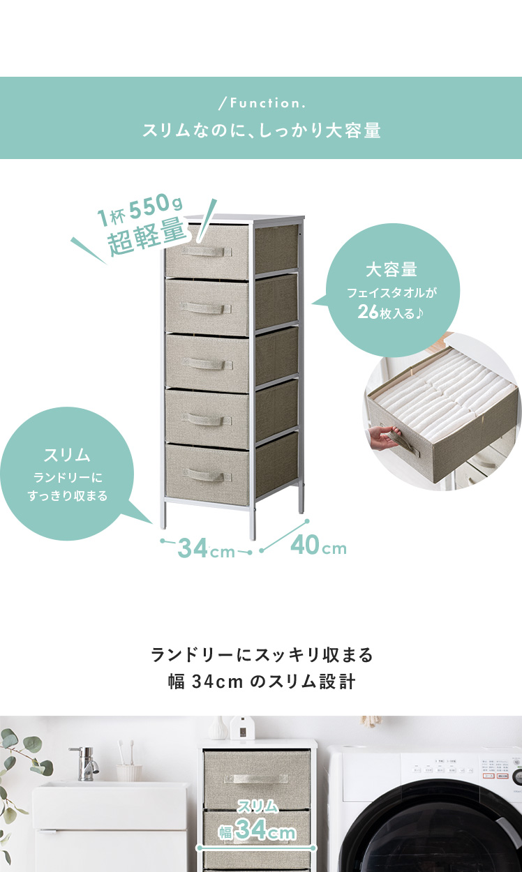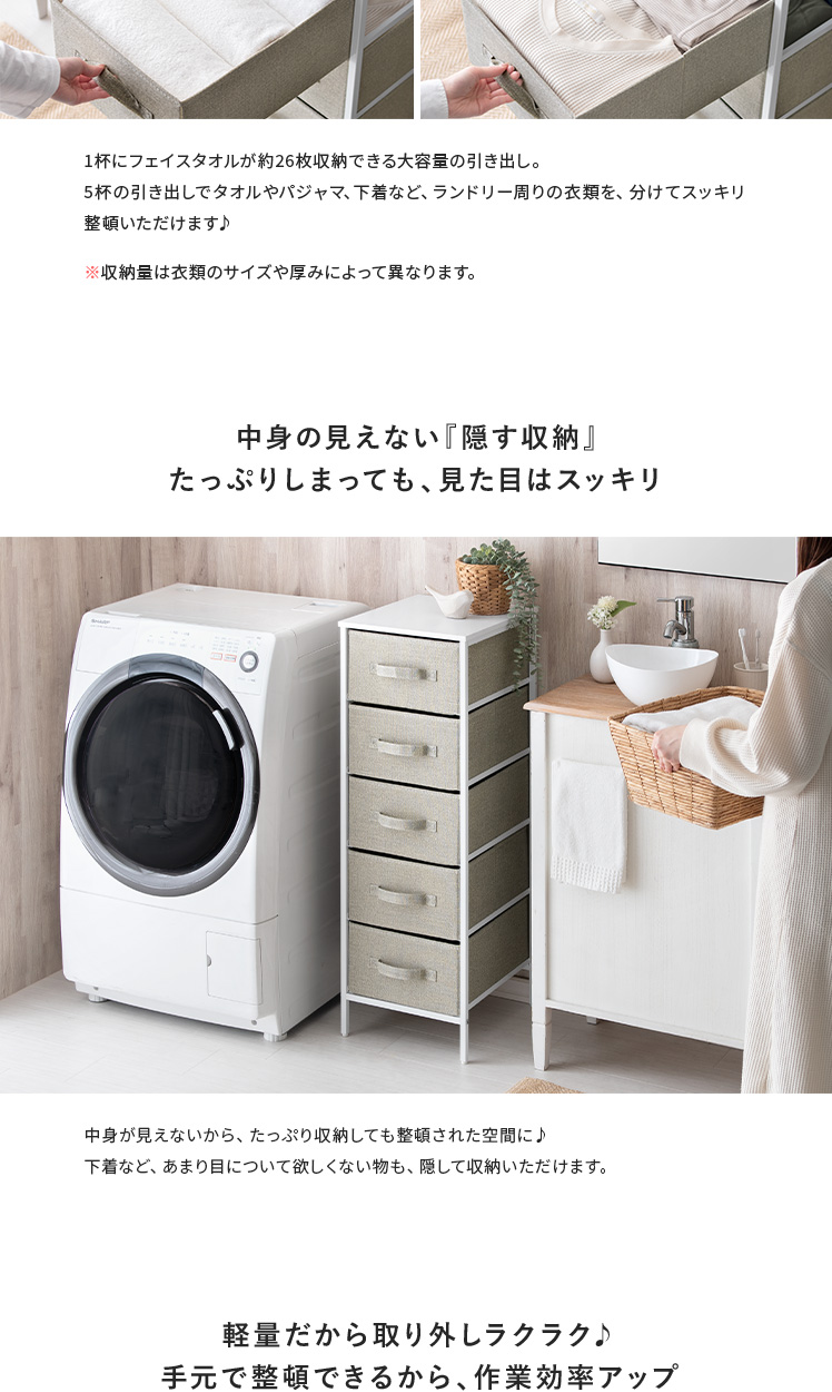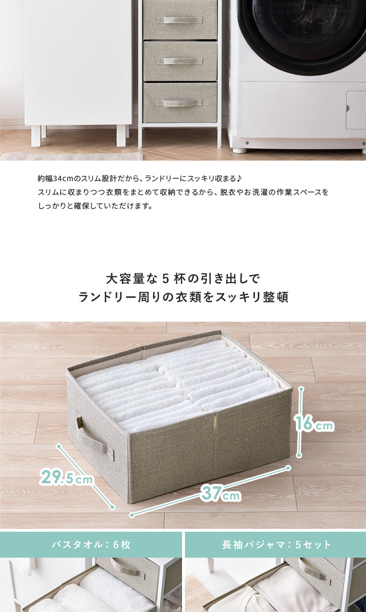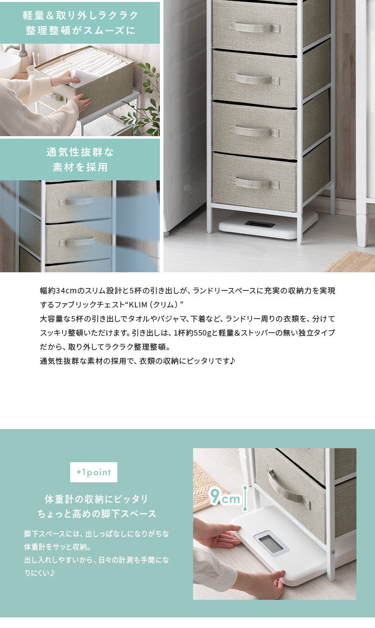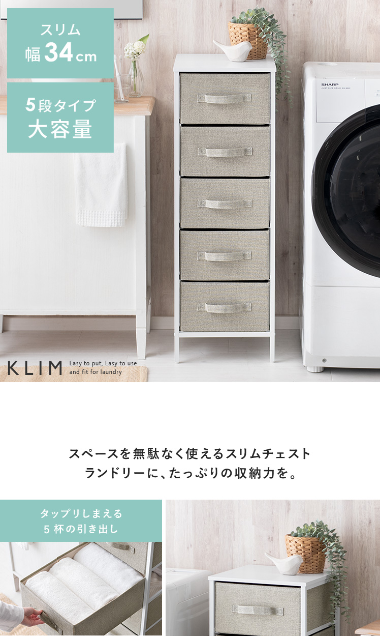 ファブリックチェスト KLIM〔クリム〕5杯タイプ [幅34/5段]/幅約34cmのスリム設計と5杯の引き出しが、ランドリースペースに充実の収納力を実現するファブリックチェスト“KLIM(クリム)”大容量な5杯の引き出しでタオルやパジャマ、下着など、ランドリー周りの衣類を、分けてスッキリ整頓いただけます。引き出しは、1杯約550gと軽量&ストッパーの無い独立タイプだから、取り外してラクラク整理整頓。通気性抜群な素材の採用で、衣類の収納にピッタリです♪