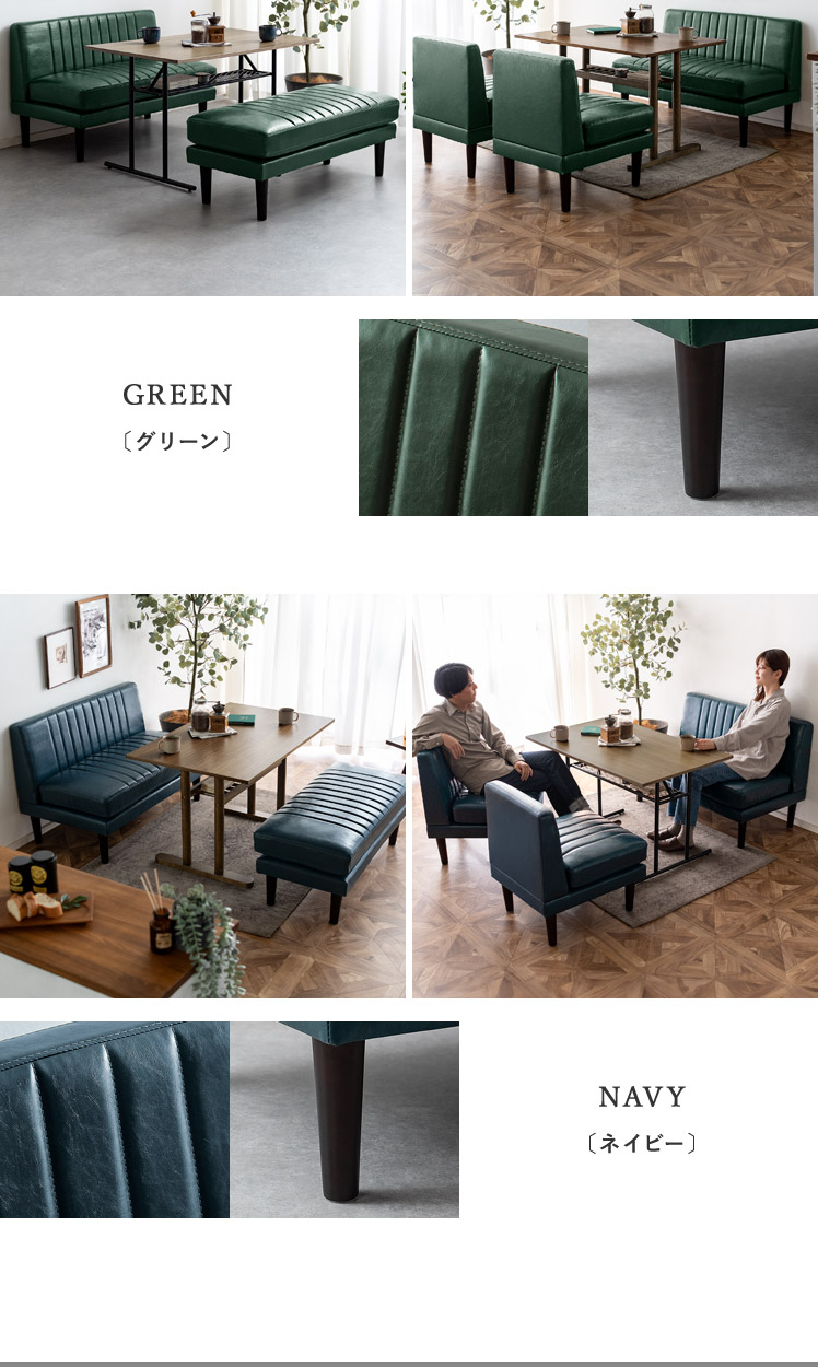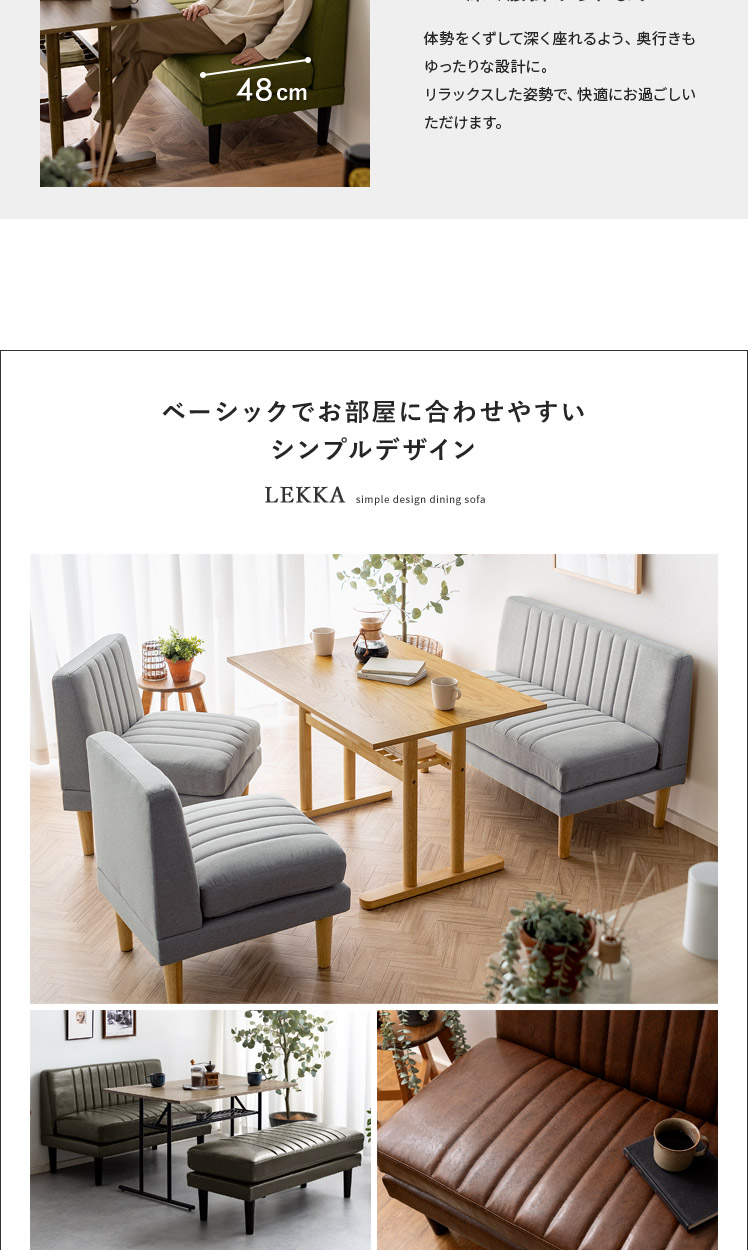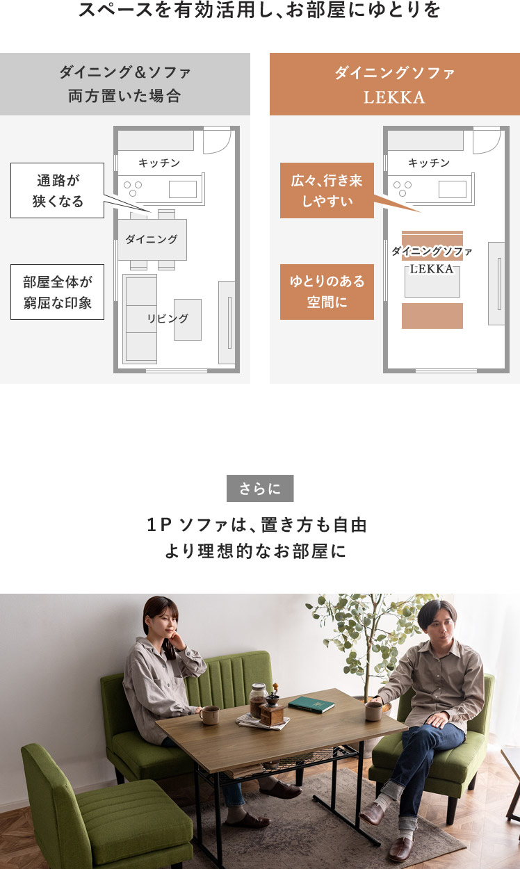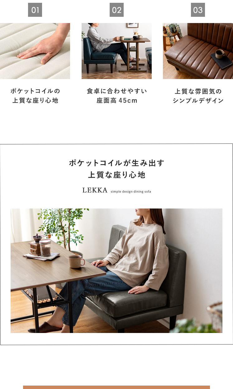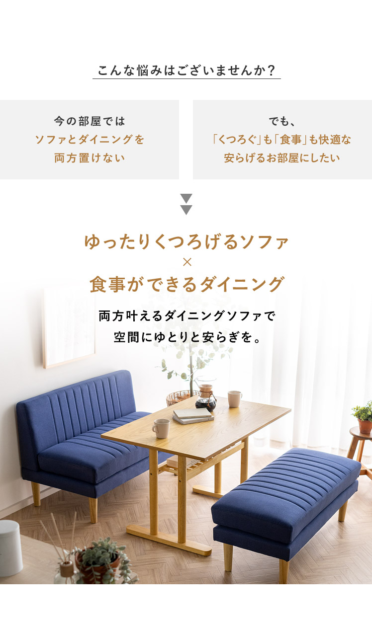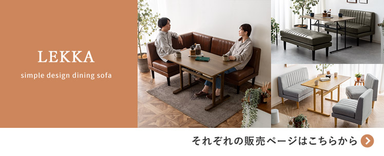 ダイニングソファ Lekka〔レッカ〕 ソファ・ベンチセット/「くつろぐ」「食事する」を1台で叶えるダイニングソファ”LEKKA(レッカ)”これ1台で、ゆったりくつろげるソファとしても、みんなで食事ができるダイニングとしてもお使いいただけるので、空間を有効活用し、ゆとりのあるお部屋に。また、座面にはベッドのマットレスにも使用されるポケットコイルを使用し、贅沢で格別な座り心地に仕上げました。