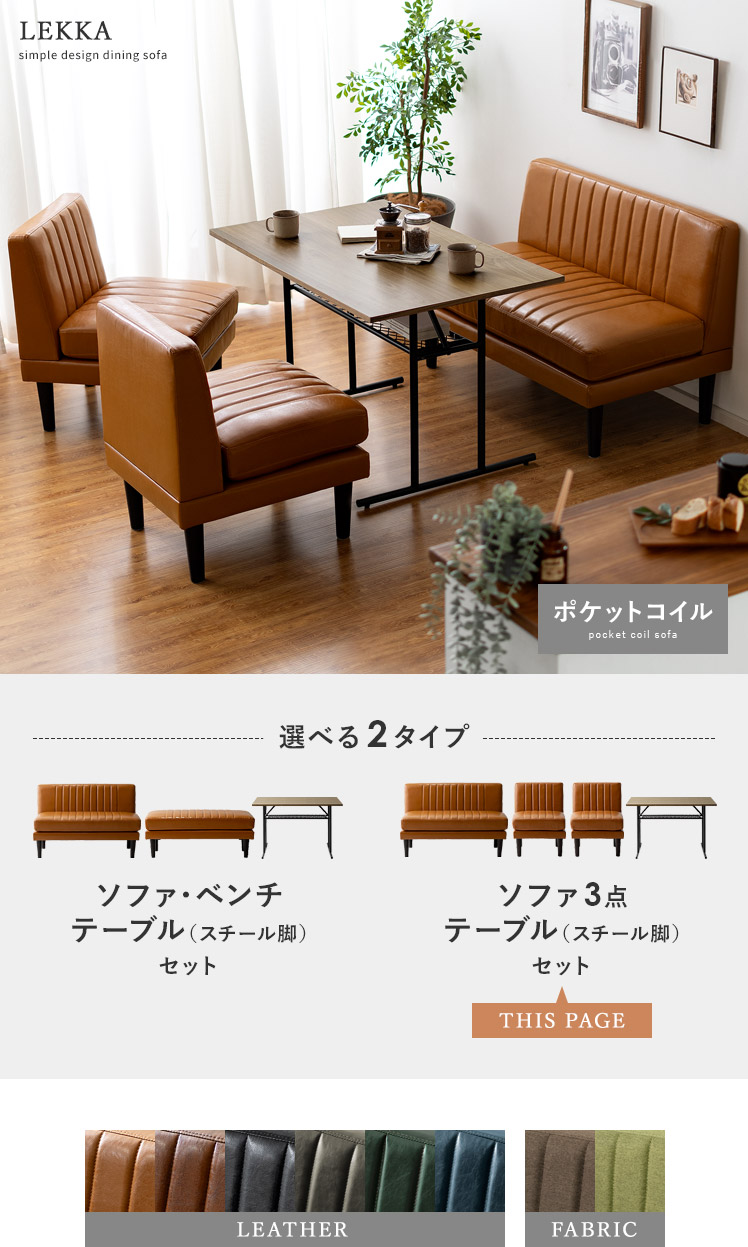 ダイニングソファ Lekka〔レッカ〕ソファ3点・テーブルセット/「くつろぐ」「食事する」を1台で叶えるダイニングソファ”LEKKA(レッカ)”これ1台で、ゆったりくつろげるソファとしても、みんなで食事ができるダイニングとしてもお使いいただけるので、空間を有効活用し、ゆとりのあるお部屋に。また、座面にはベッドのマットレスにも使用されるポケットコイルを使用し、贅沢で格別な座り心地に仕上げました。