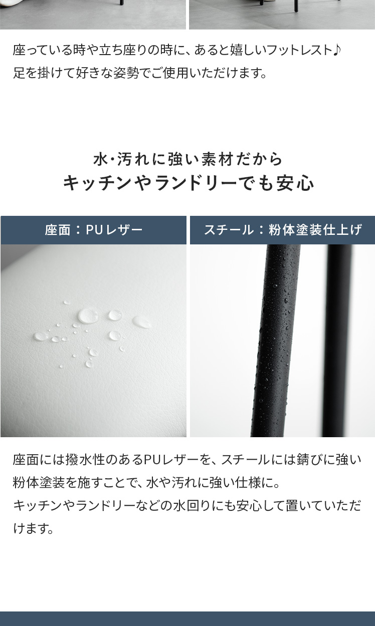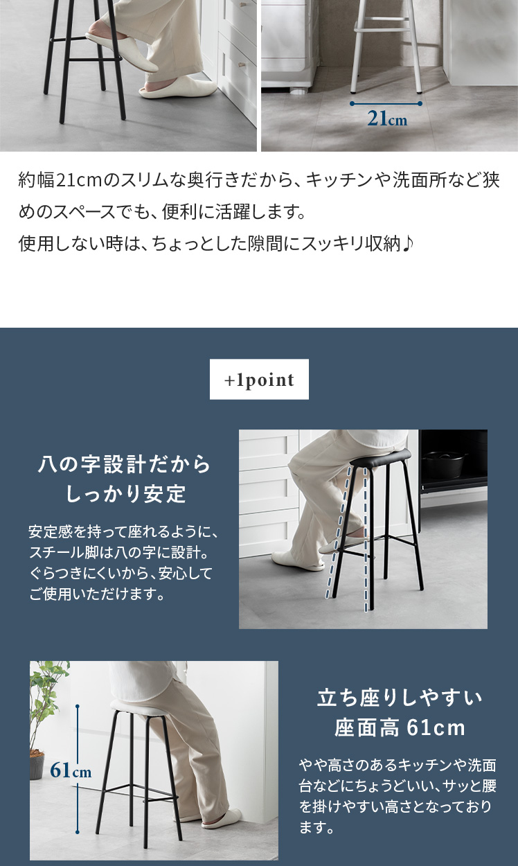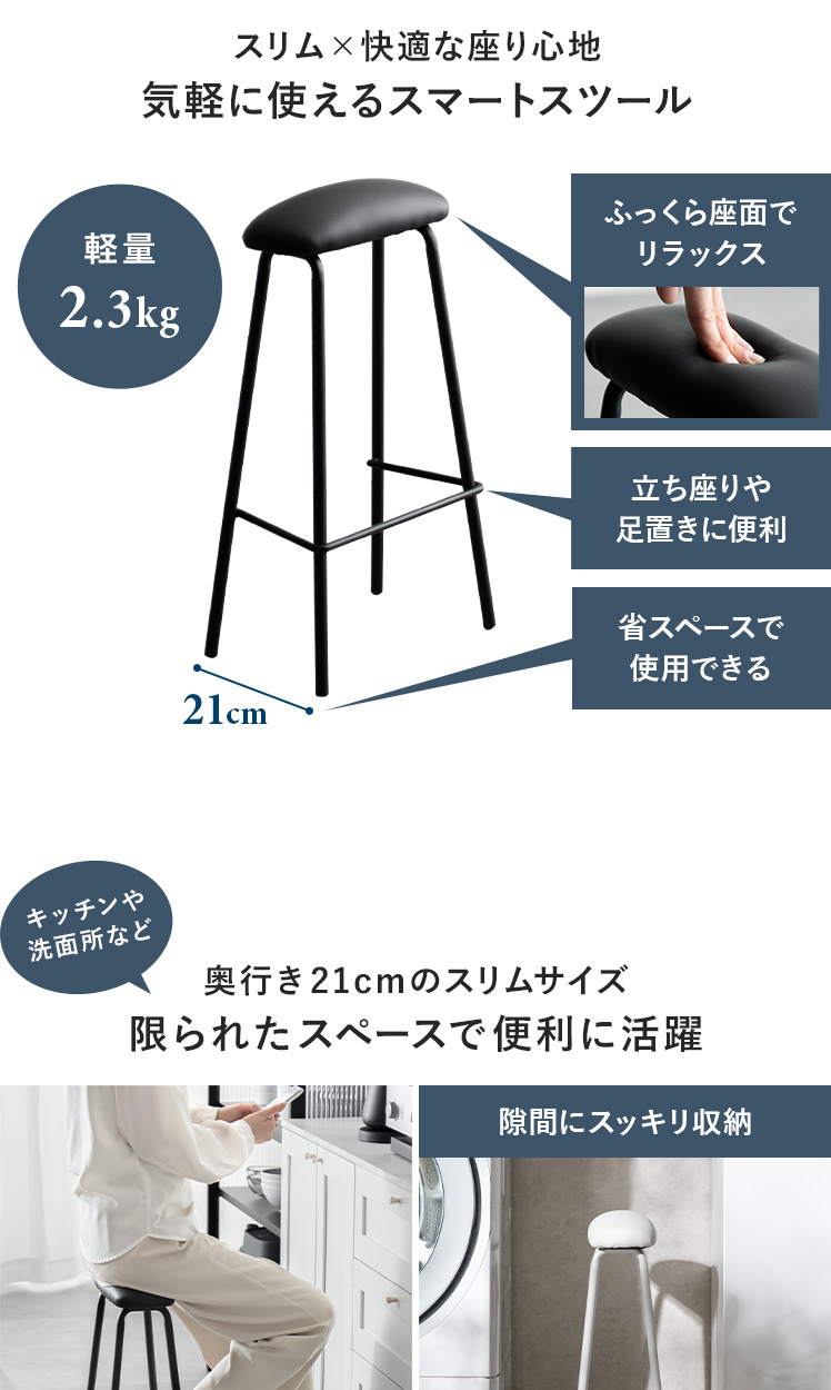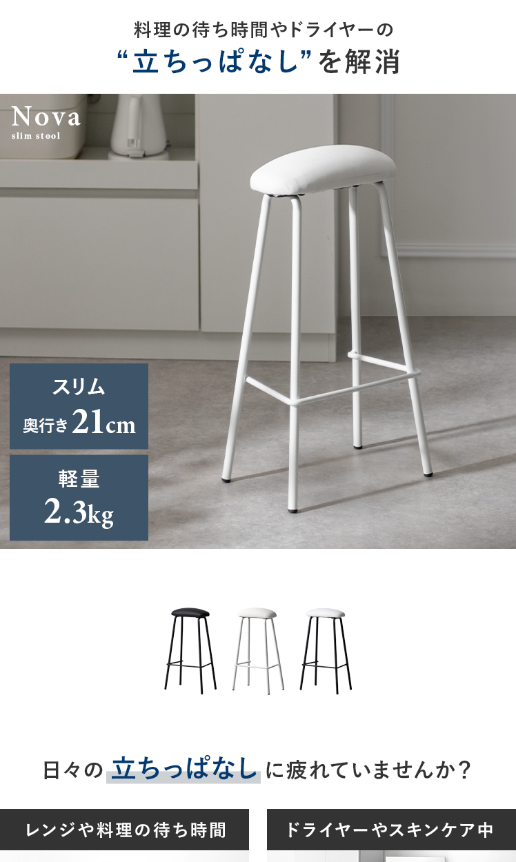 スリムスツール Nova〔ノヴァ〕/料理の待ち時間やドライヤーなど、日々の立ちっぱなしを解消するスリムスツール“Nova(ノヴァ)”約幅21cmのスリムな奥行きだから、キッチンや洗面所など狭めのスペースでも、便利に活躍します。約2.3kgの軽量設計で、持ち運びもラクラク。ちょこっとだけ使用したい時も、サッと運んで便利に活躍します。肉厚クッションやフットレス付きで座り心地も快適♪日々の立ちっぱなしを解消して、束の間をちゃっかり休憩タイムに。