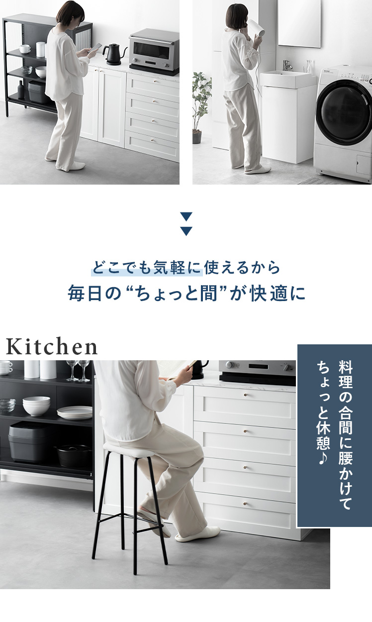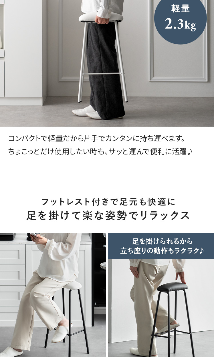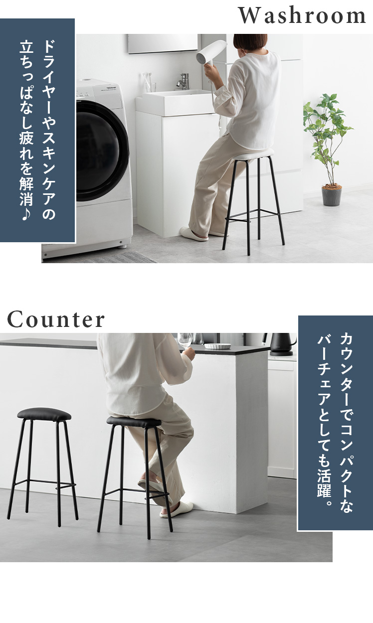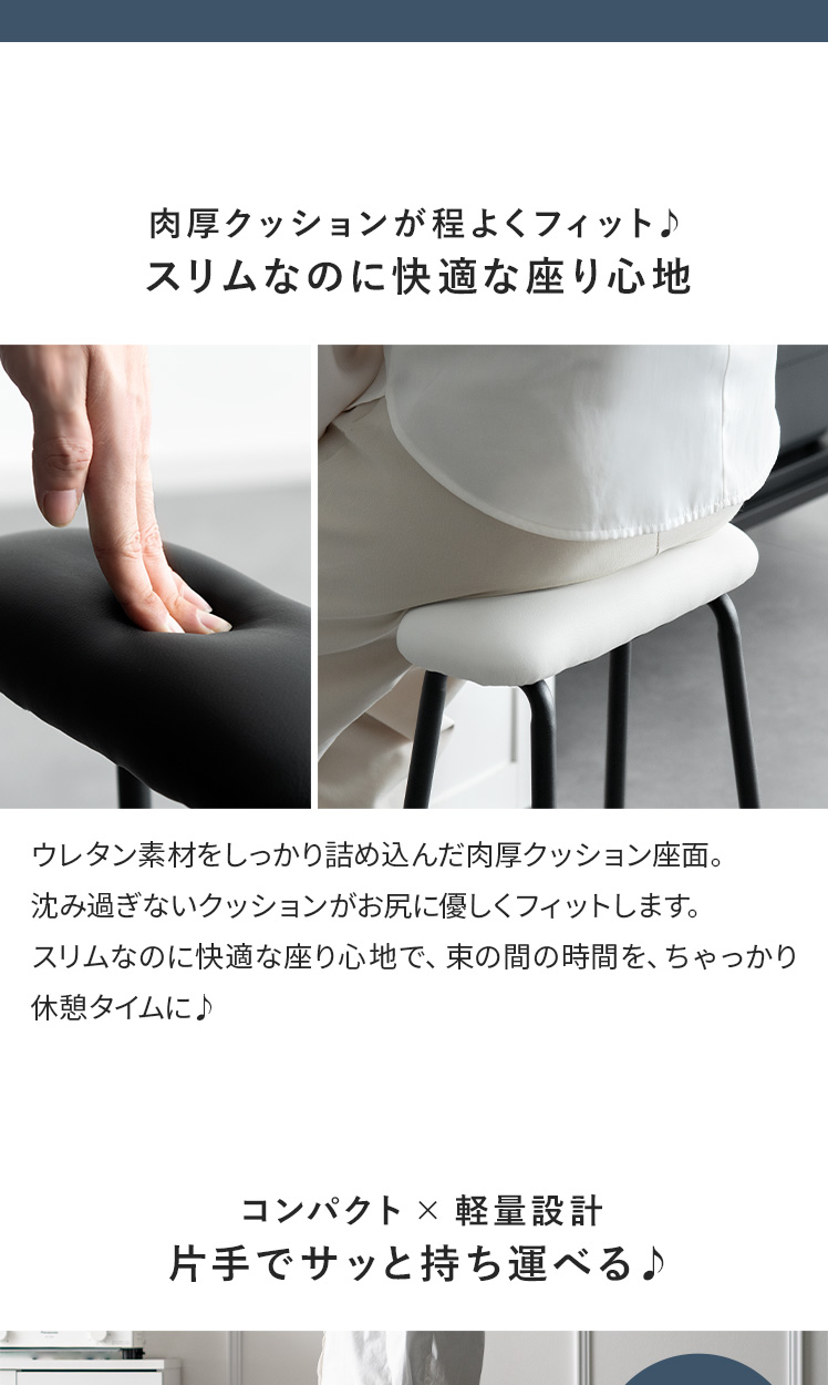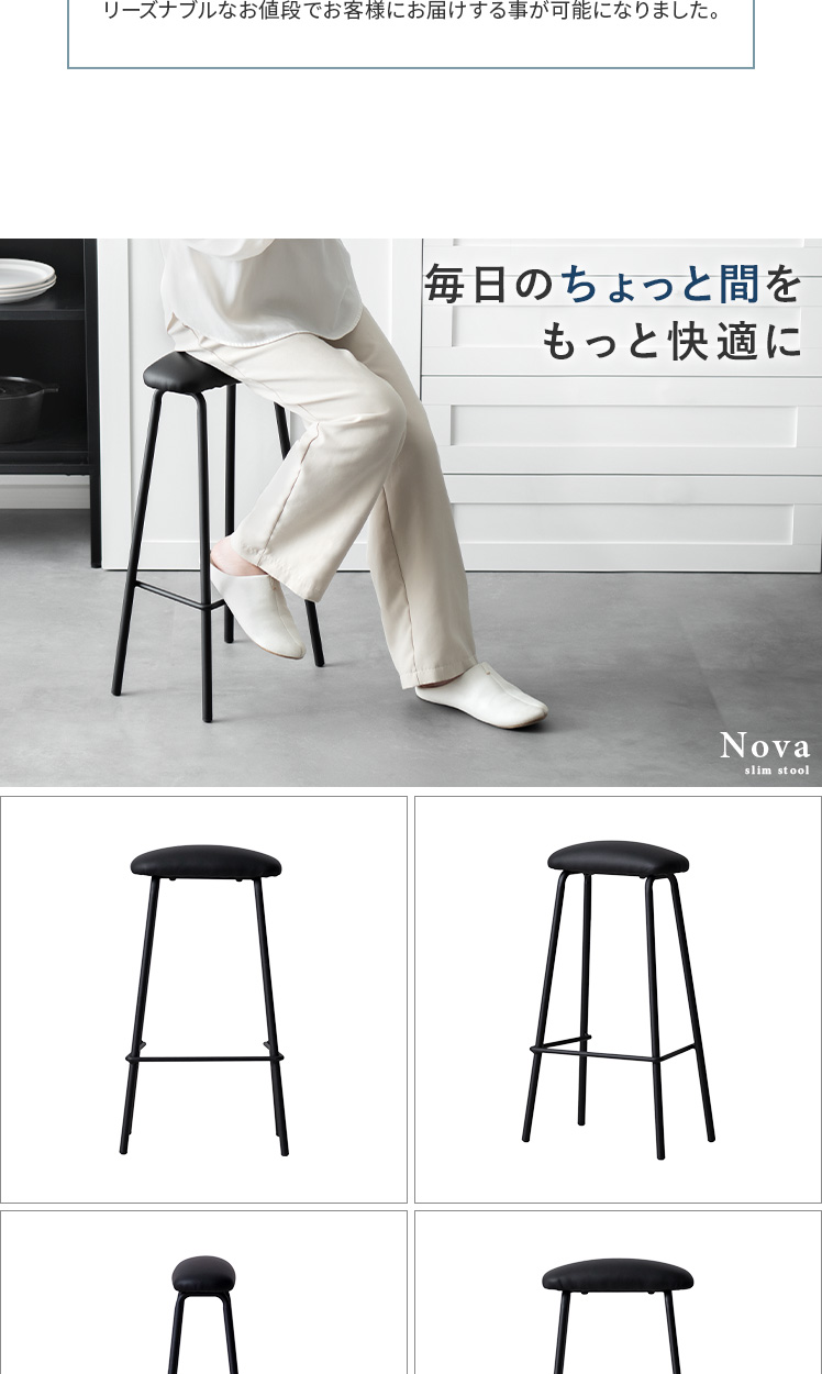 スリムスツール Nova〔ノヴァ〕/料理の待ち時間やドライヤーなど、日々の立ちっぱなしを解消するスリムスツール“Nova(ノヴァ)”約幅21cmのスリムな奥行きだから、キッチンや洗面所など狭めのスペースでも、便利に活躍します。約2.3kgの軽量設計で、持ち運びもラクラク。ちょこっとだけ使用したい時も、サッと運んで便利に活躍します。肉厚クッションやフットレス付きで座り心地も快適♪日々の立ちっぱなしを解消して、束の間をちゃっかり休憩タイムに。