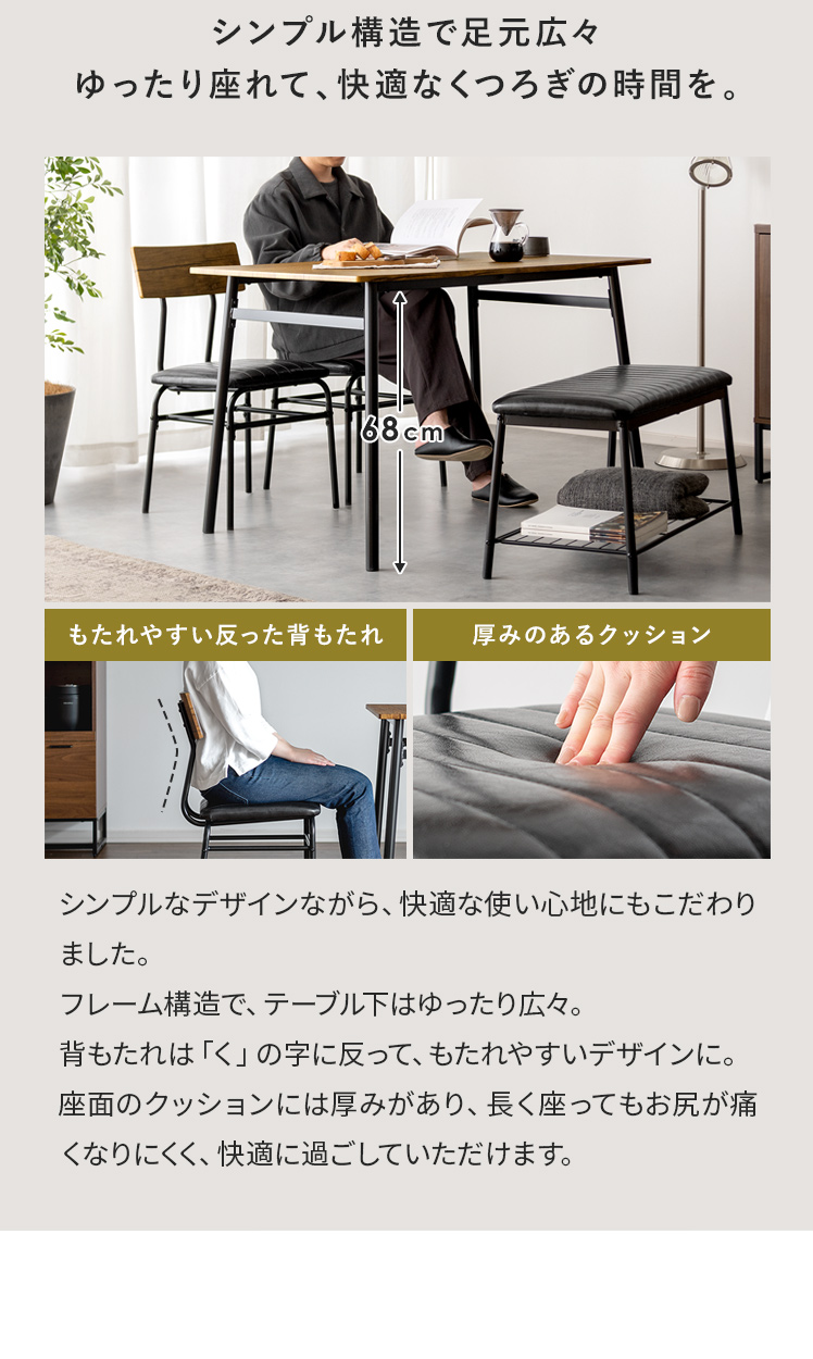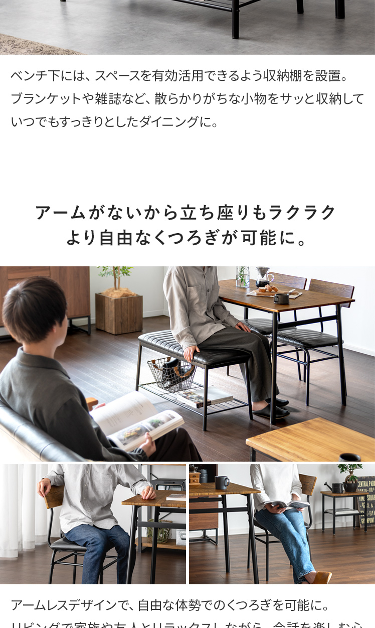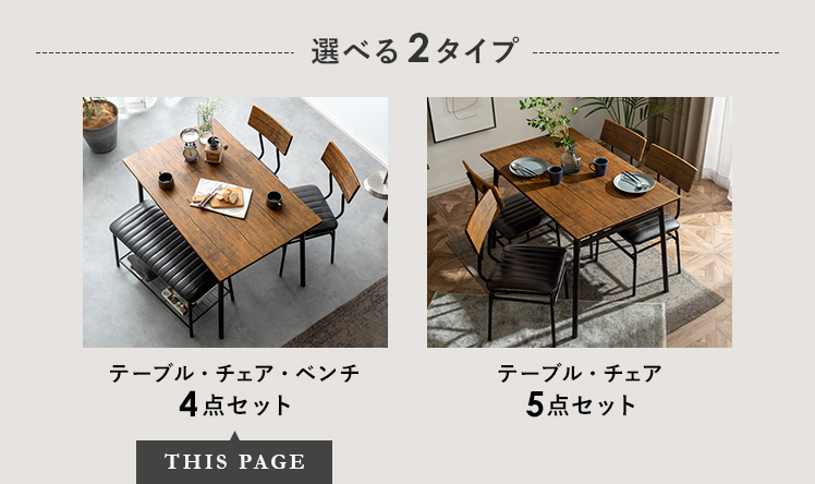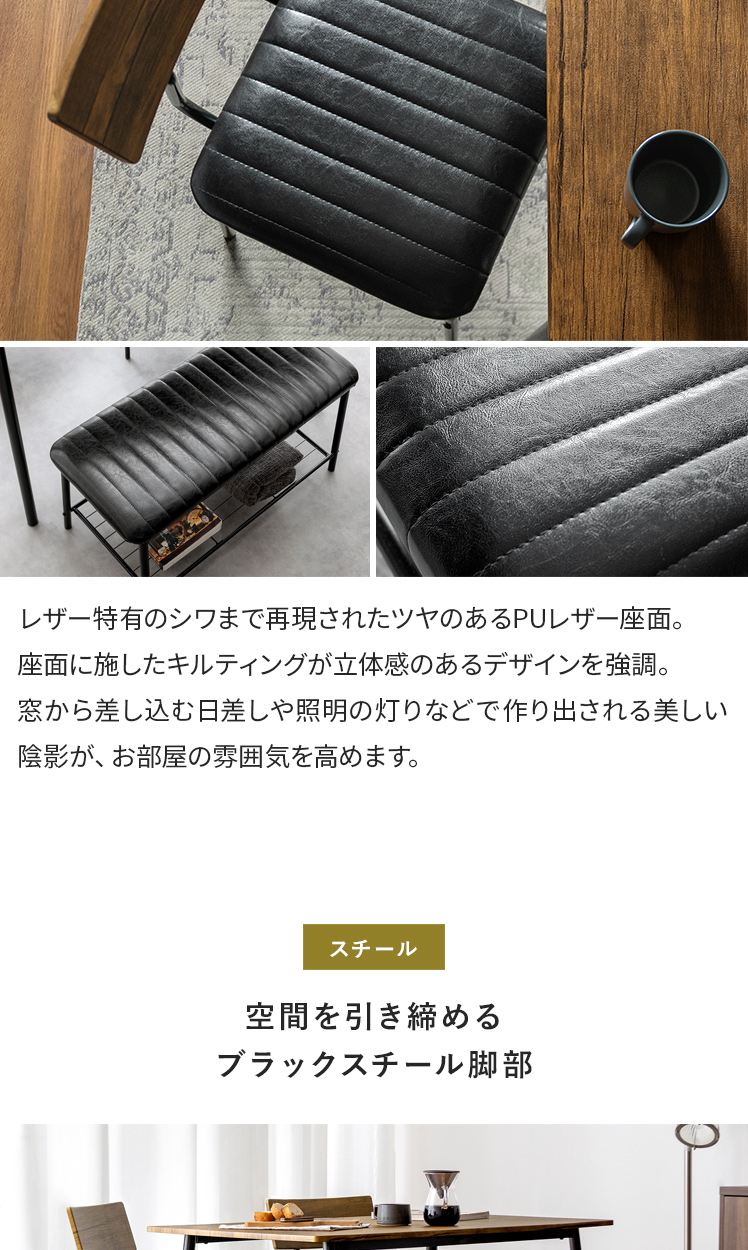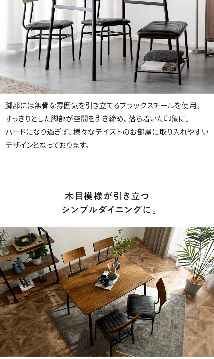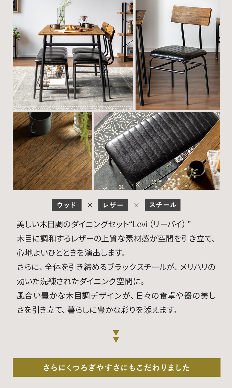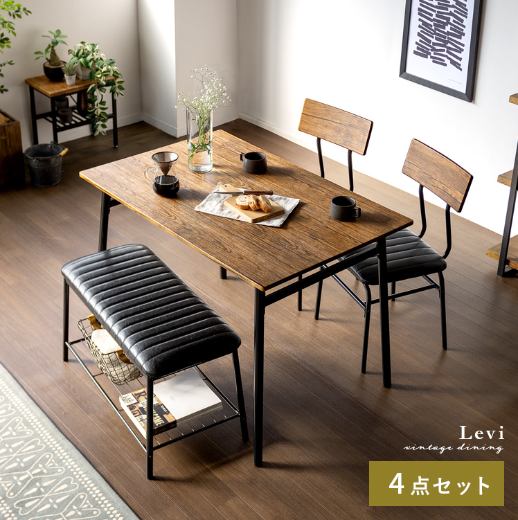 ヴィンテージ風ダイニング4点セット Levi〔リーバイ〕/美しい木目模様のダイニング4点セット“Levi(リーバイ)”木目に合わせたレザーのチェア&ベンチ。上質な素材感が空間を引き立て、心地よい時間を演出します。さらに、全体を引き締めるブラックスチールで、メリハリの効いた素敵なダイニング空間に。洗練された木目調デザインで、日々の料理や食器を引き立て、暮らしをより豊かに彩っていただけます。