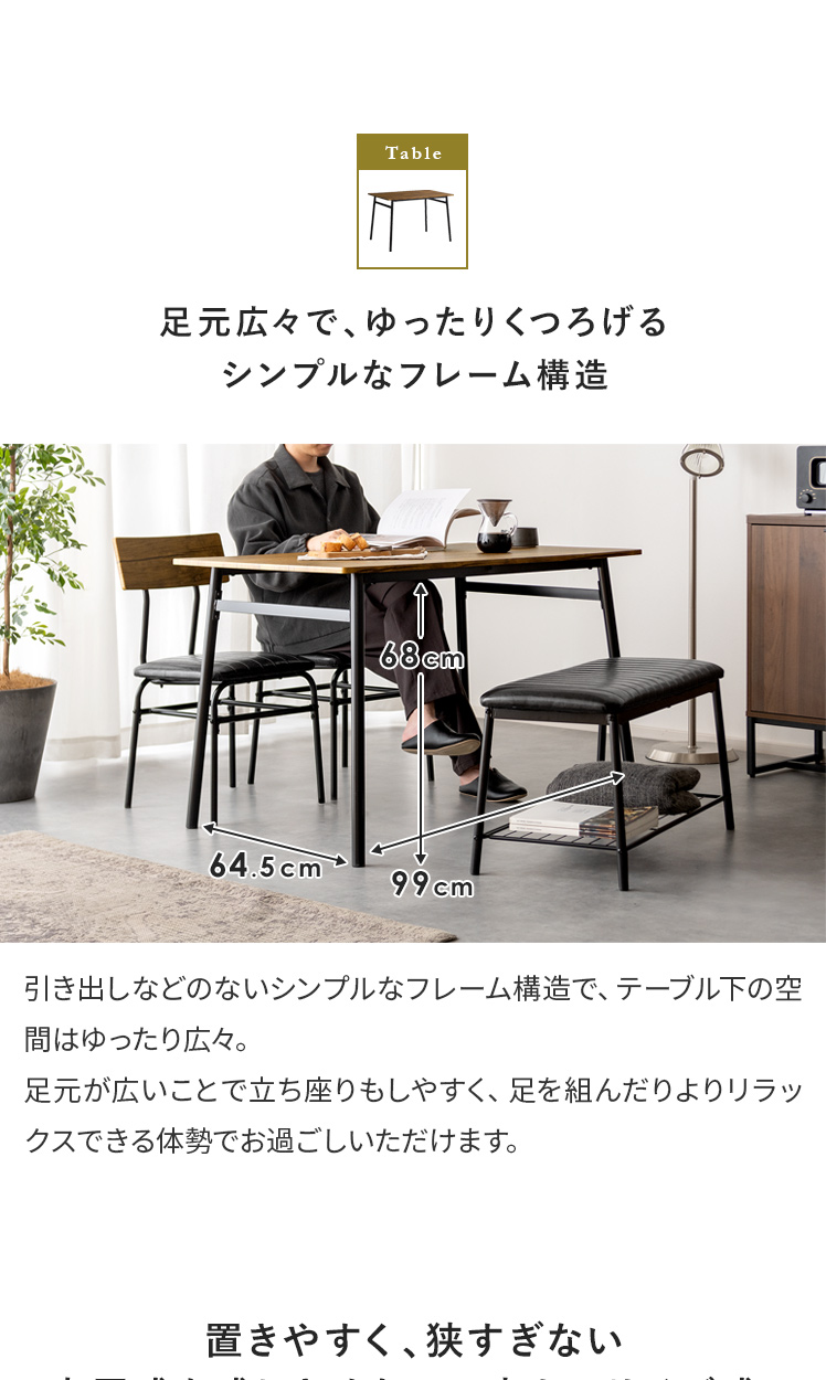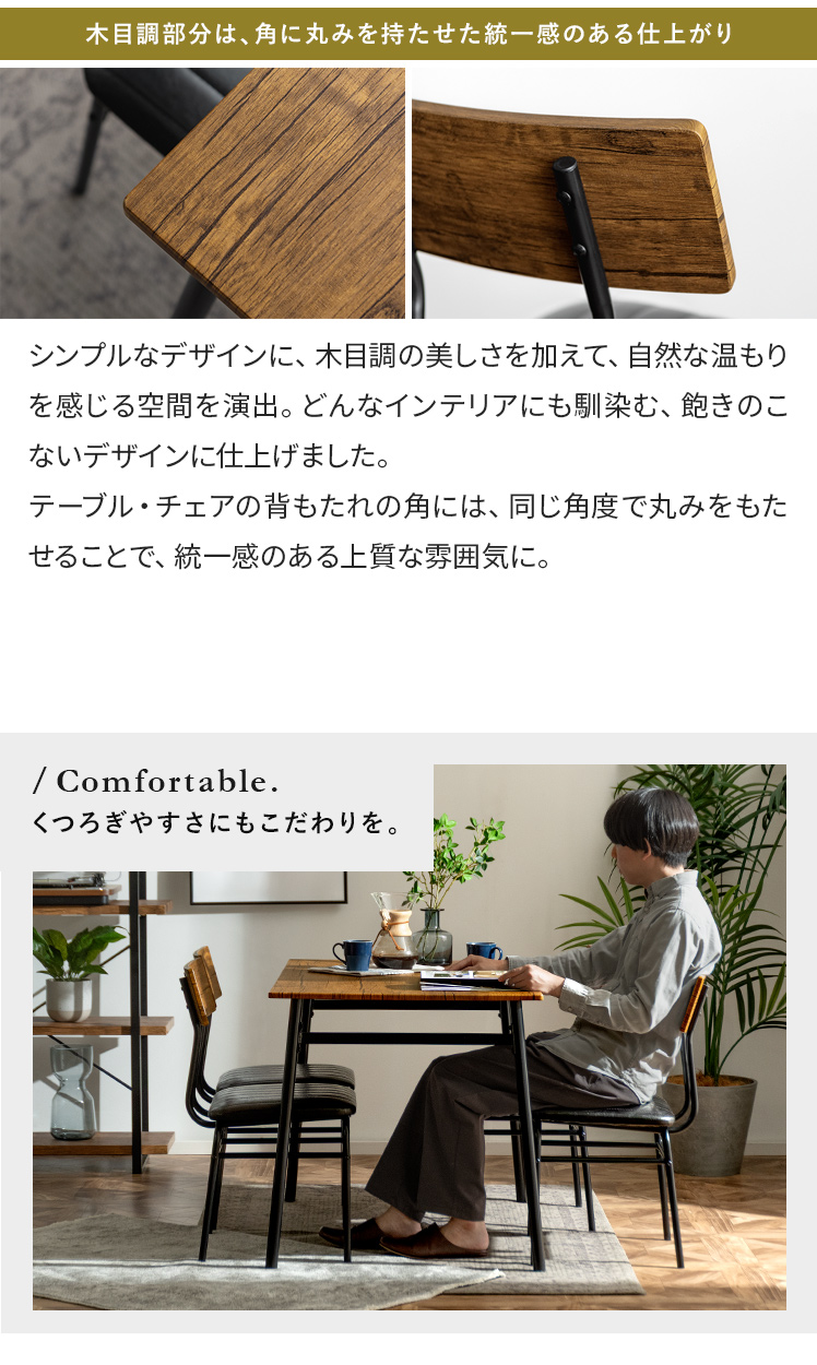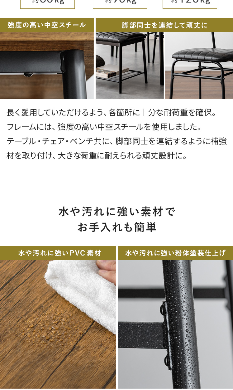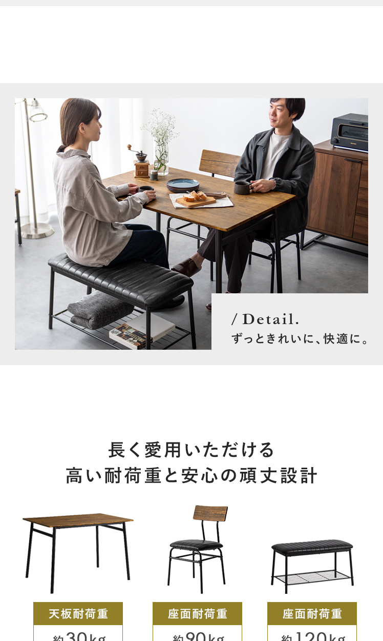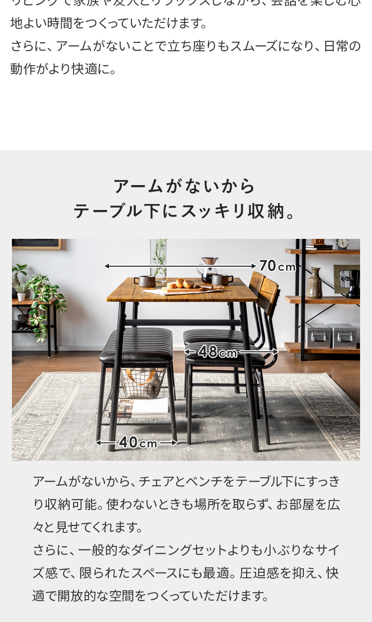 ヴィンテージ風ダイニング4点セット Levi〔リーバイ〕/美しい木目模様のダイニング4点セット“Levi(リーバイ)”木目に合わせたレザーのチェア&ベンチ。上質な素材感が空間を引き立て、心地よい時間を演出します。さらに、全体を引き締めるブラックスチールで、メリハリの効いた素敵なダイニング空間に。洗練された木目調デザインで、日々の料理や食器を引き立て、暮らしをより豊かに彩っていただけます。