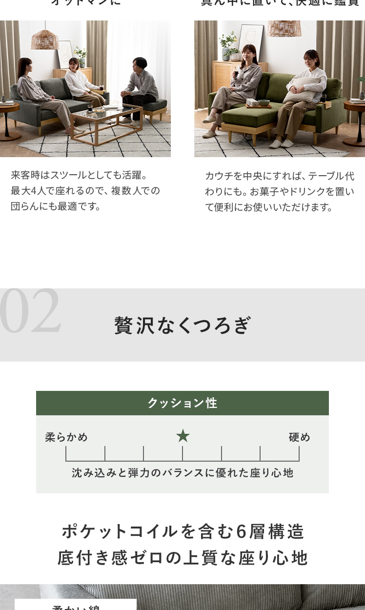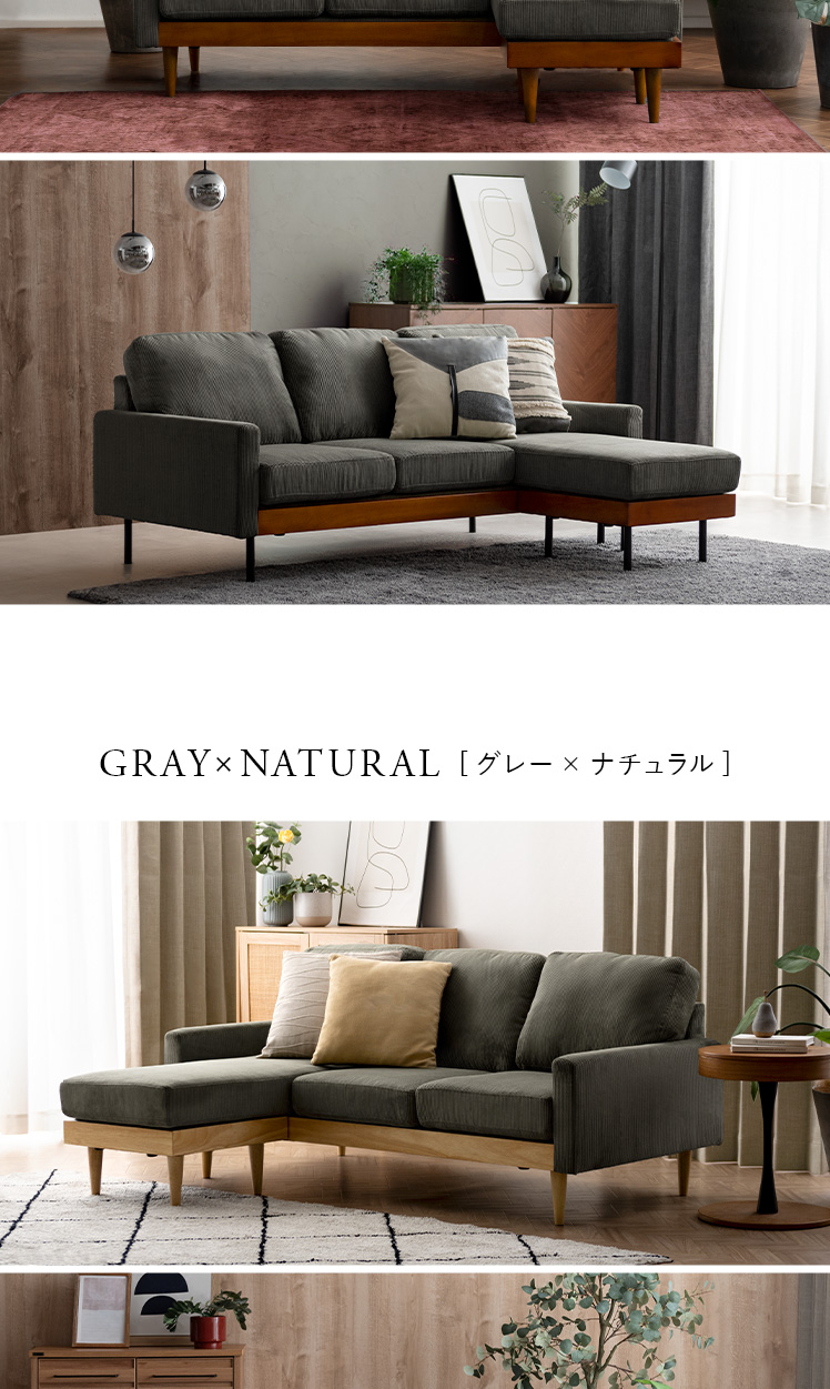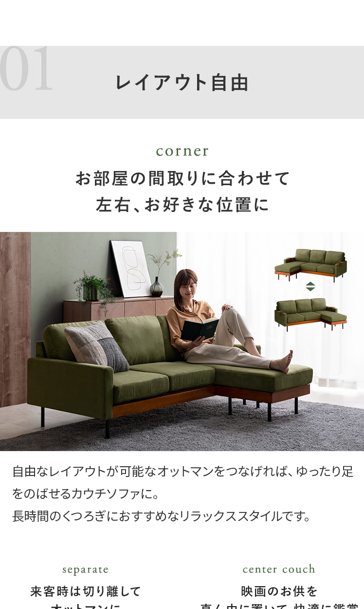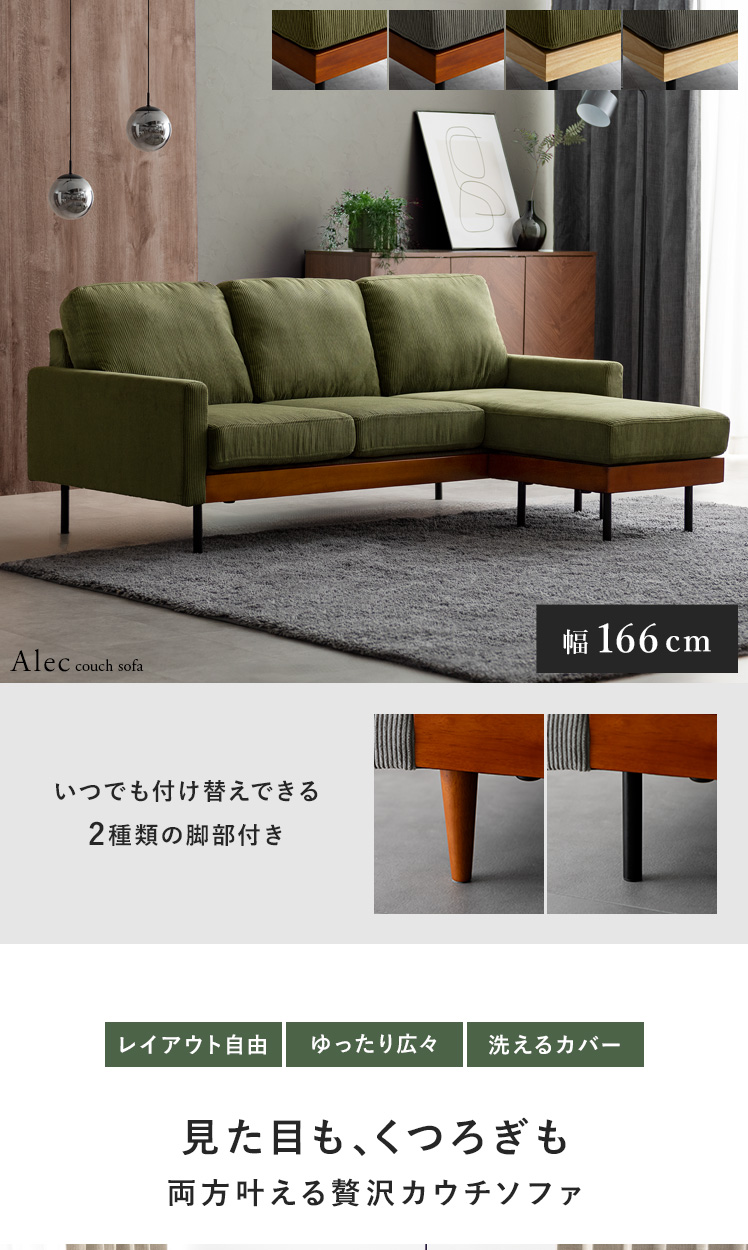 カウチソファ Alec〔アレック〕/暖かみを感じるコーデュロイ生地と風合いのある天然木が美しいカウチソファ。ポケットコイルが生む、贅沢な座り心地で身体を優しく包み込みます。また、自由なレイアウトが可能でオットマンをつなげれば、カウチソファに大変身。見た目も、くつろぎも両立させるカウチソファ“Alec(アレック)”