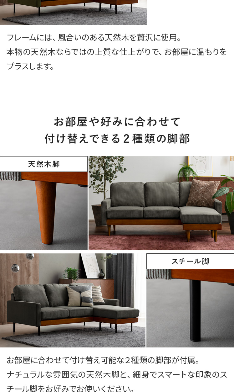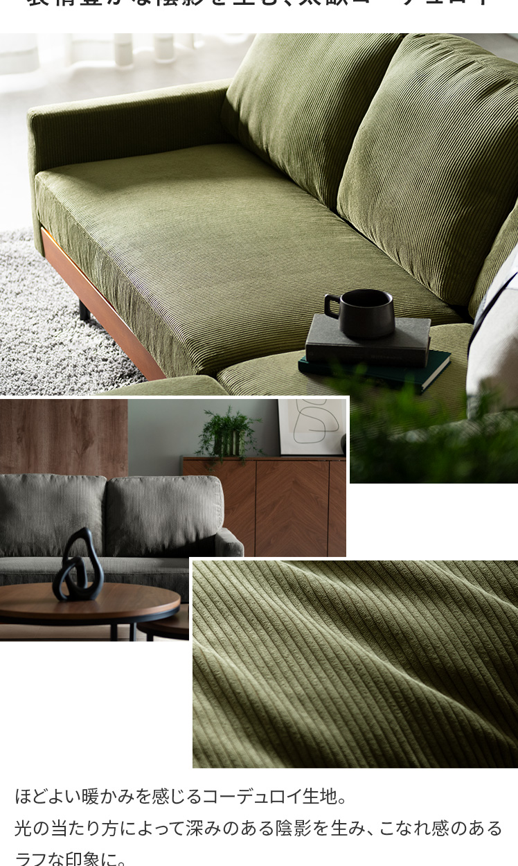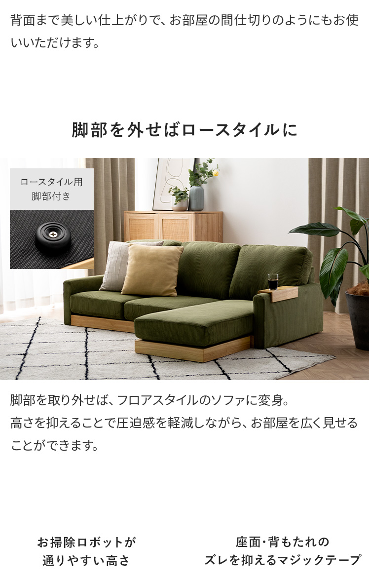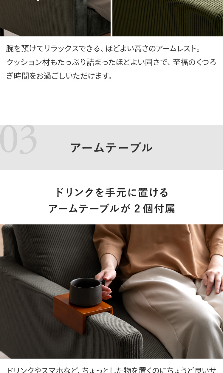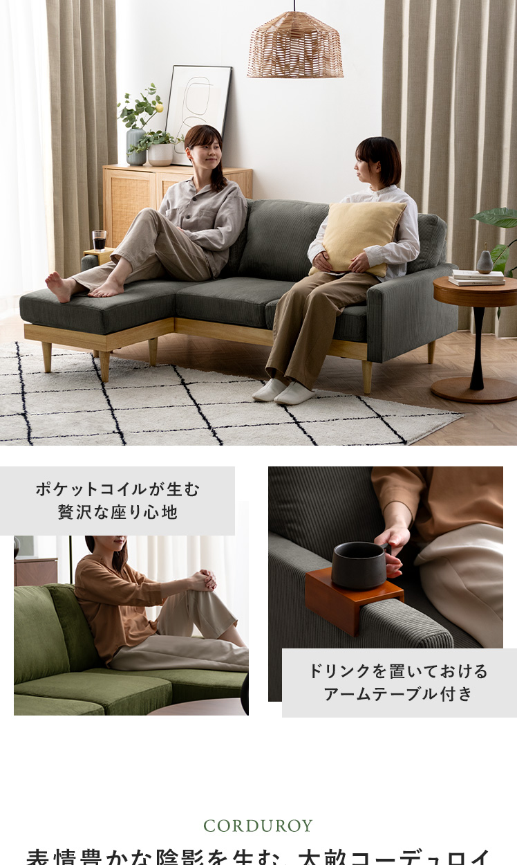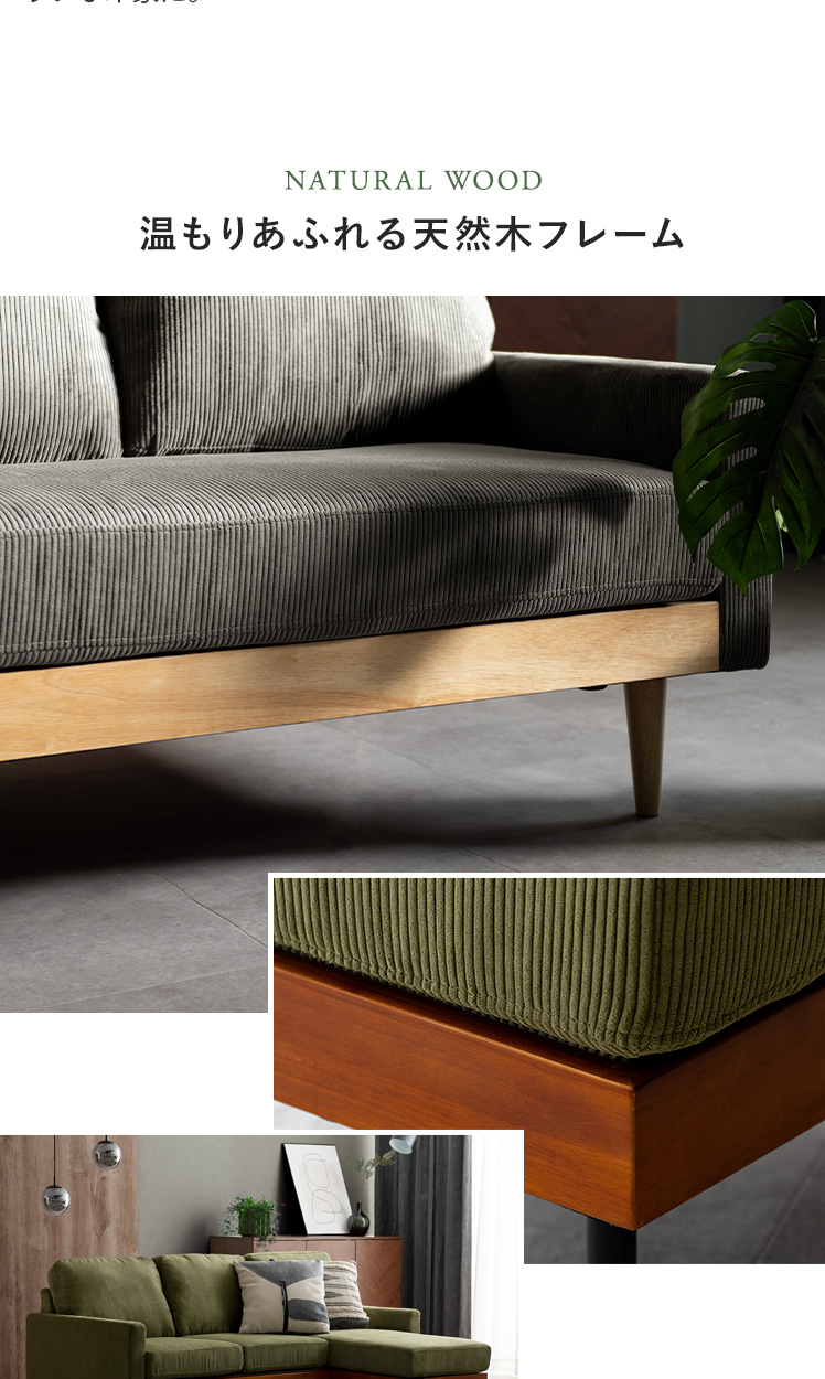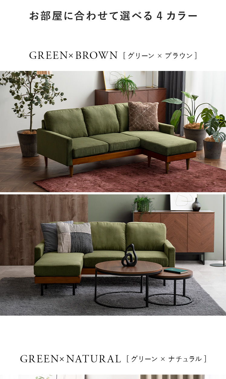 コーデュロイ コーナーソファ L字ソファ 3人掛け 天然木脚 スチール脚 アームテーブル 洗濯可能 リビング ナチュラル グリーン【5%OFFクーポン対象|公式なら毎日お得】
