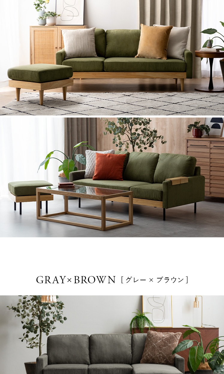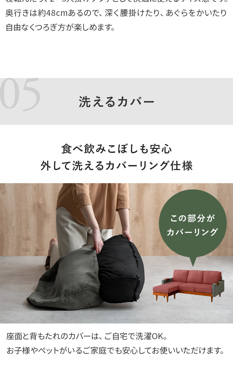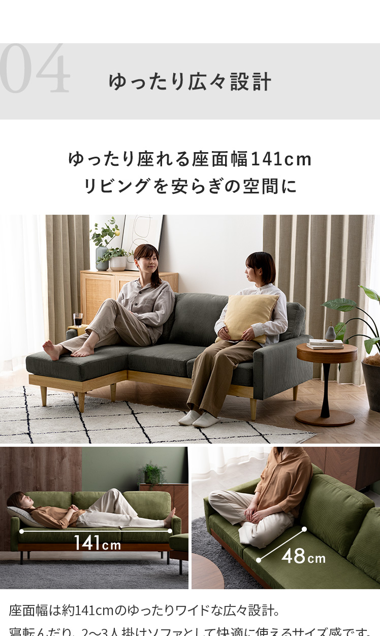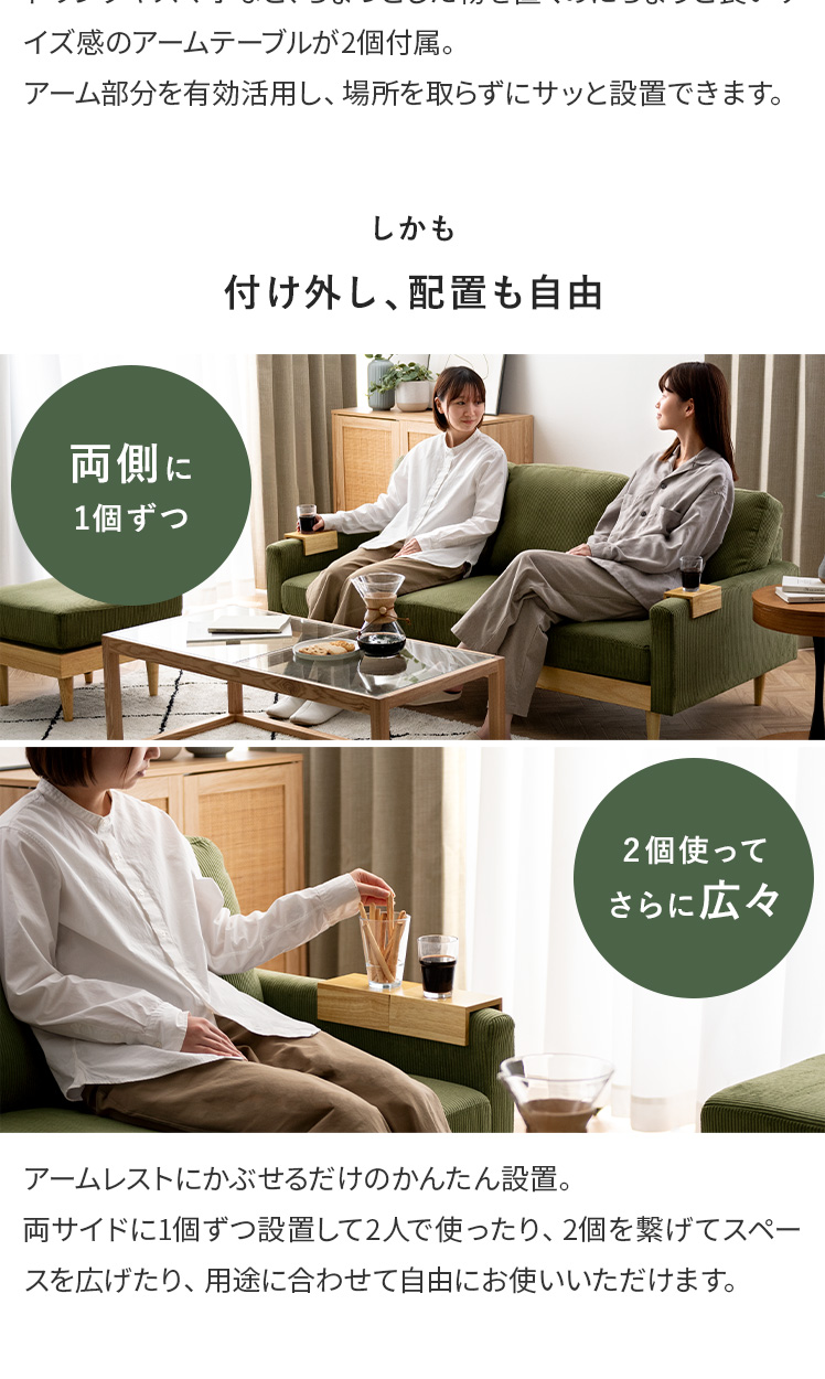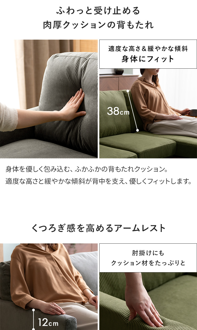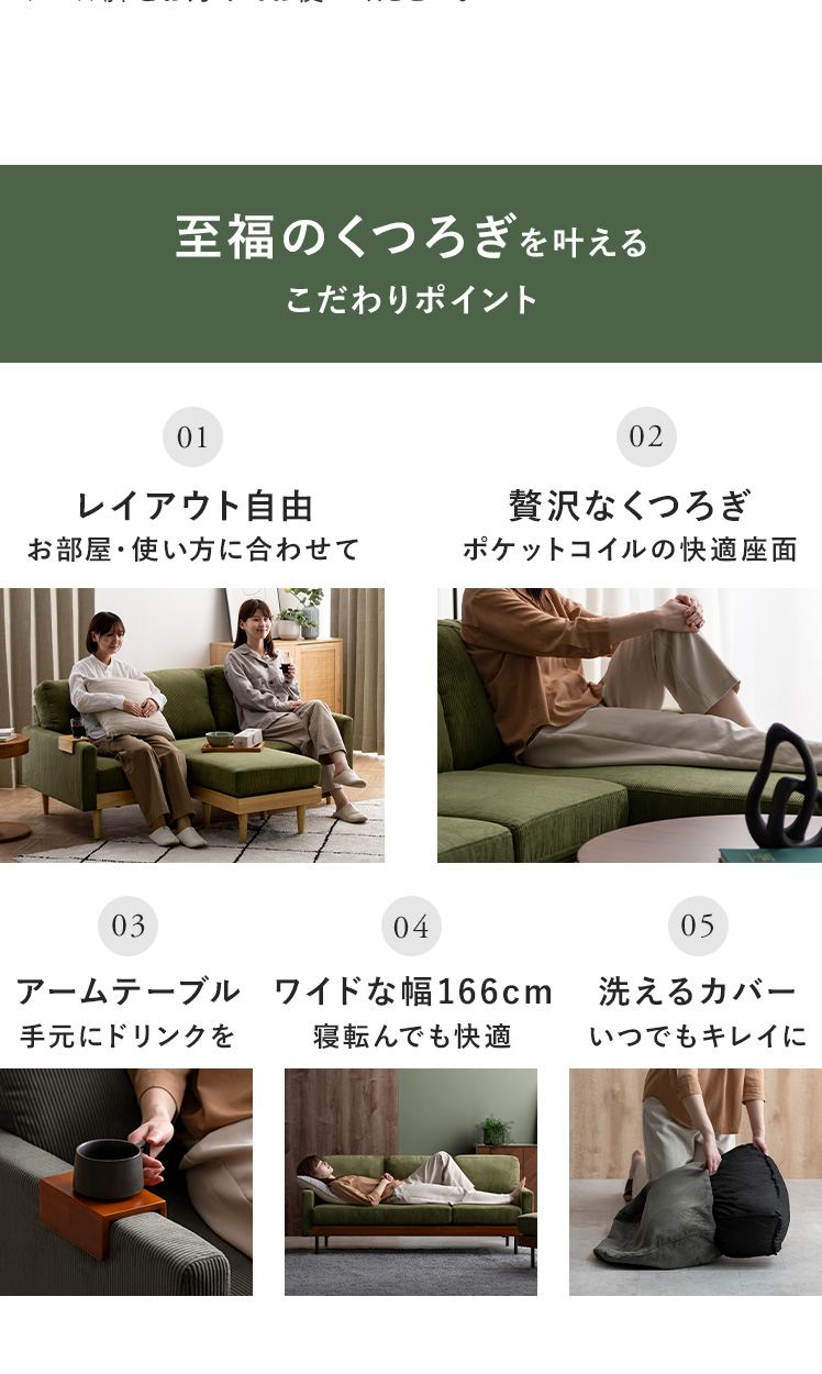 コーデュロイ コーナーソファ L字ソファ 3人掛け 天然木脚 スチール脚 アームテーブル 洗濯可能 リビング ナチュラル グリーン【5%OFFクーポン対象|公式なら毎日お得】