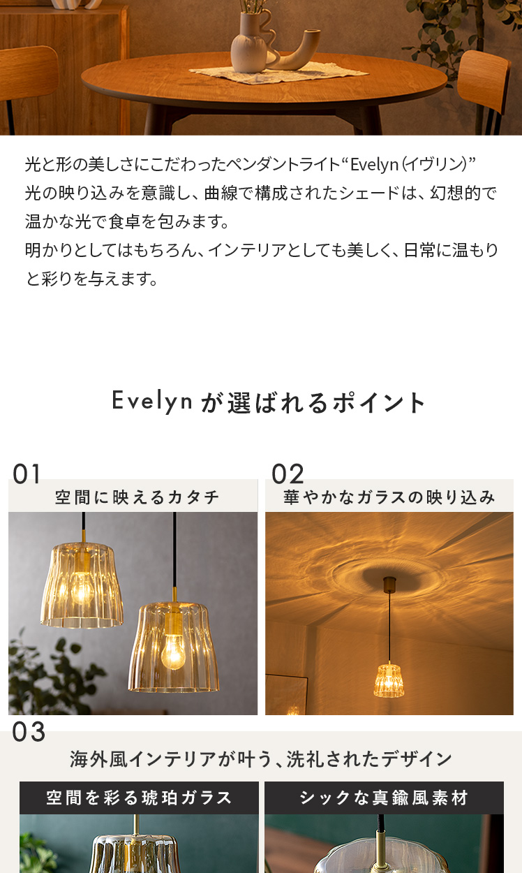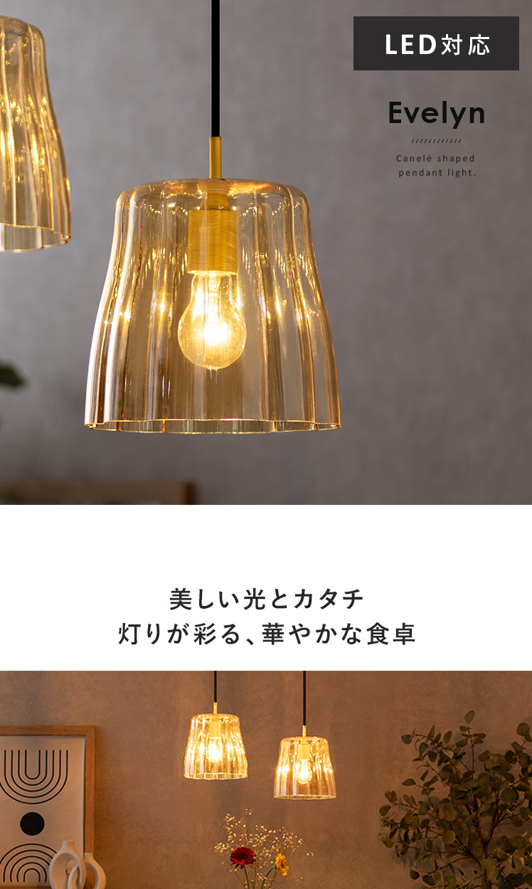 ガラスペンダントライト Evelyn〔イヴリン〕/光と形の美しさにこだわったペンダントライト“Evelyn(イヴリン)”光の映り込みを意識し、曲線で構成されたシェードは、幻想的で温かな光で食卓を包みます。明かりとしてはもちろん、インテリアとしても美しく、日常に温もりと彩りを与えます。