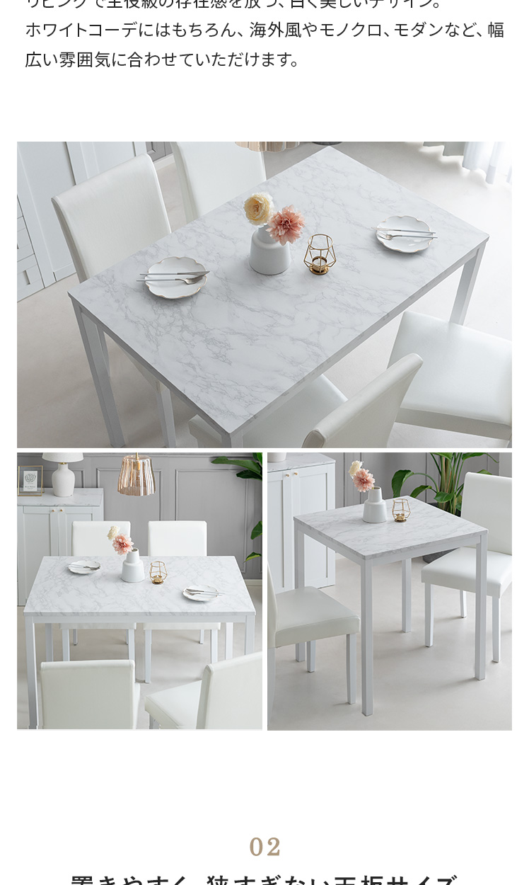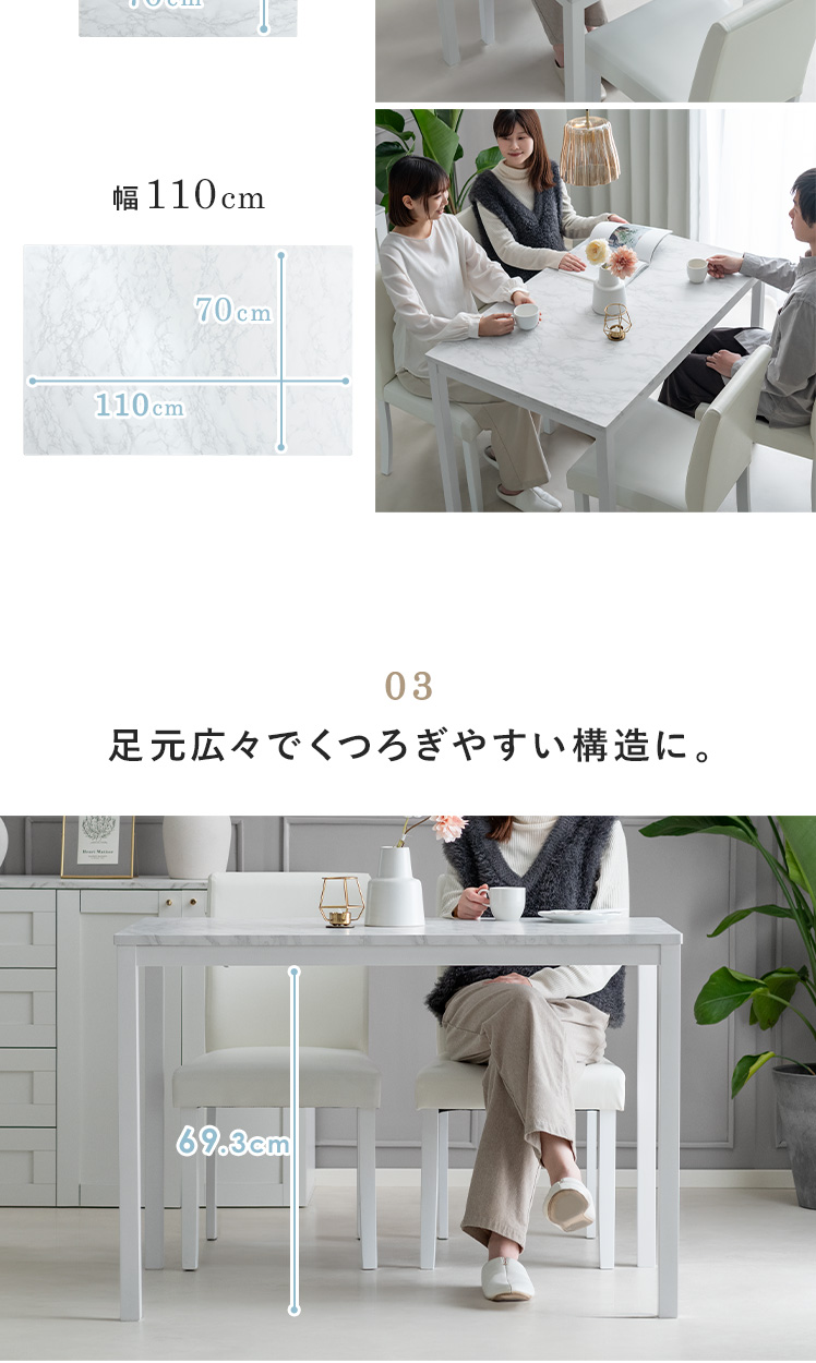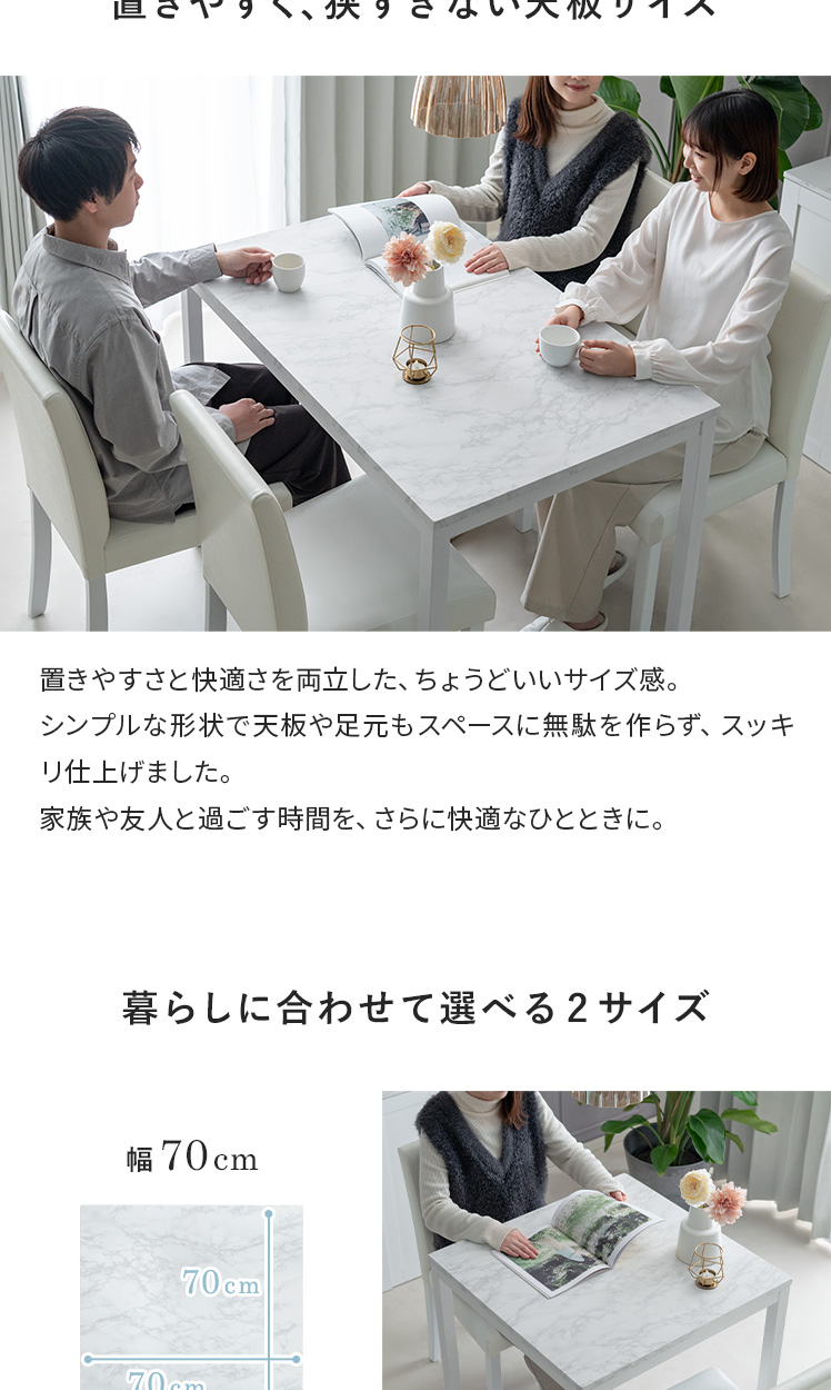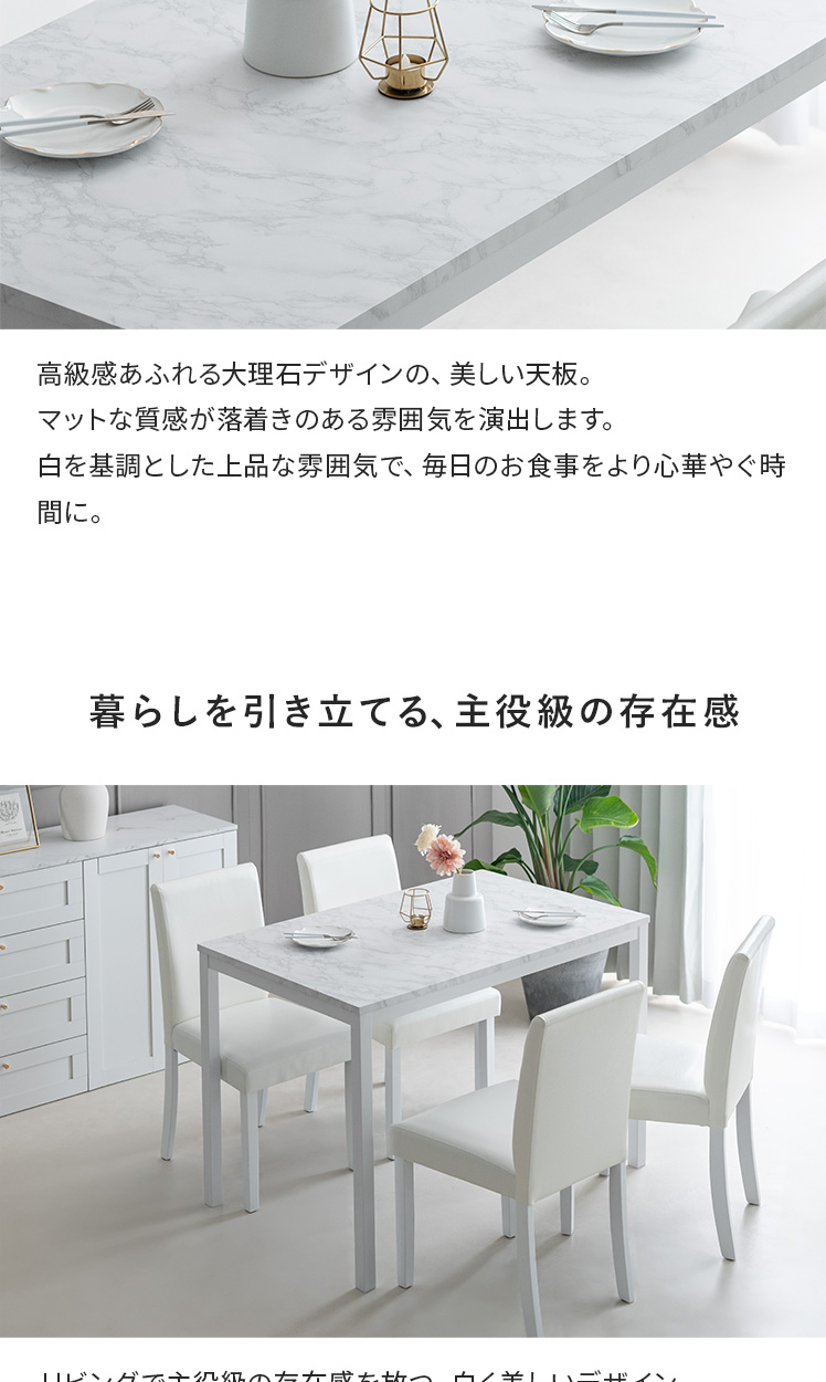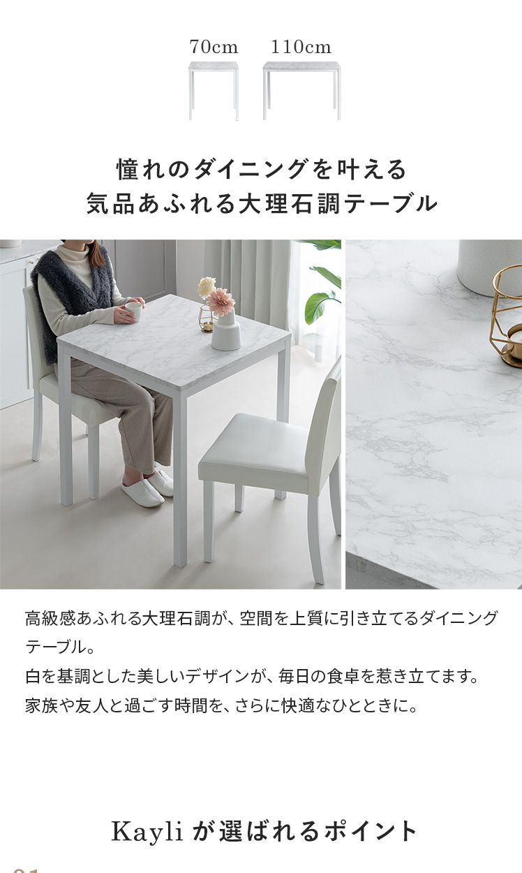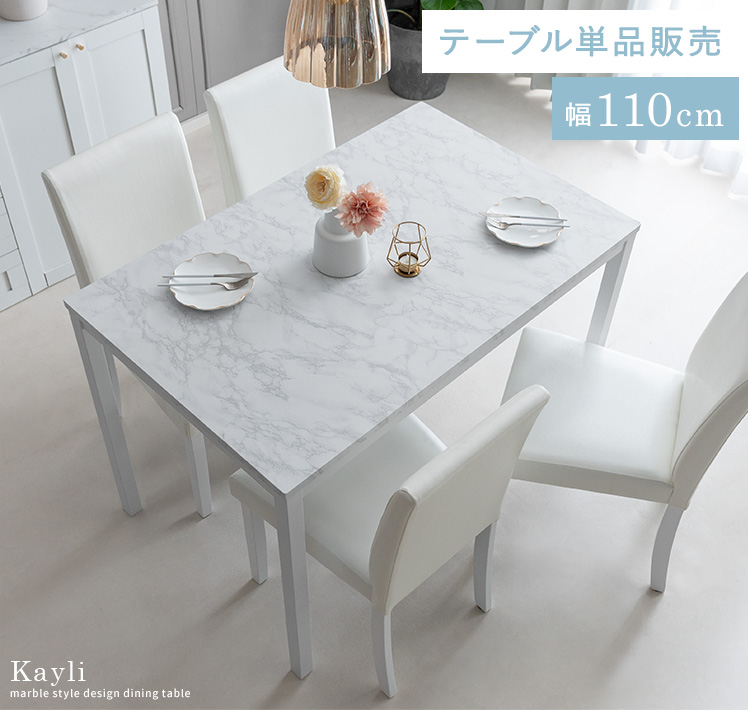 大理石調ダイニングテーブル Kayli〔ケイリ〕110×70cm/高級感あふれる大理石調が、空間を上質に引き立てるダイニングテーブル。白を基調とした美しいデザインが、毎日の食卓を惹き立てます。家族や友人と過ごす時間を、さらに快適なひとときに。