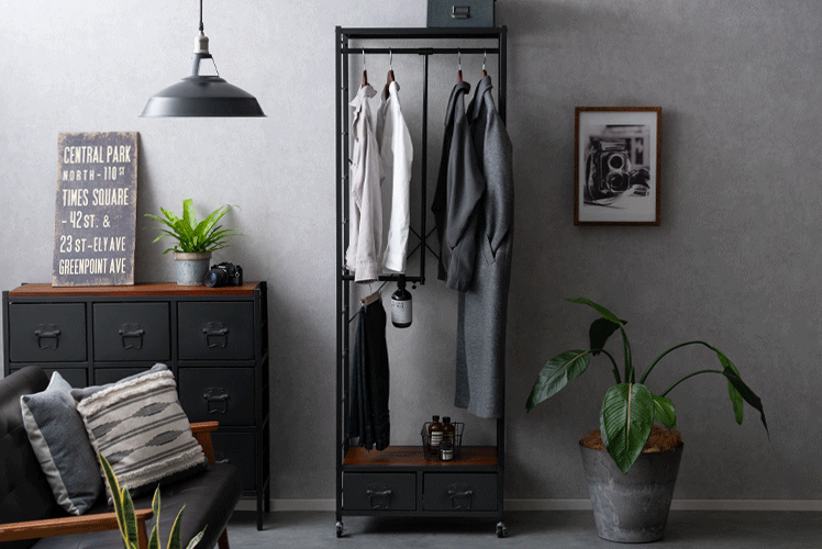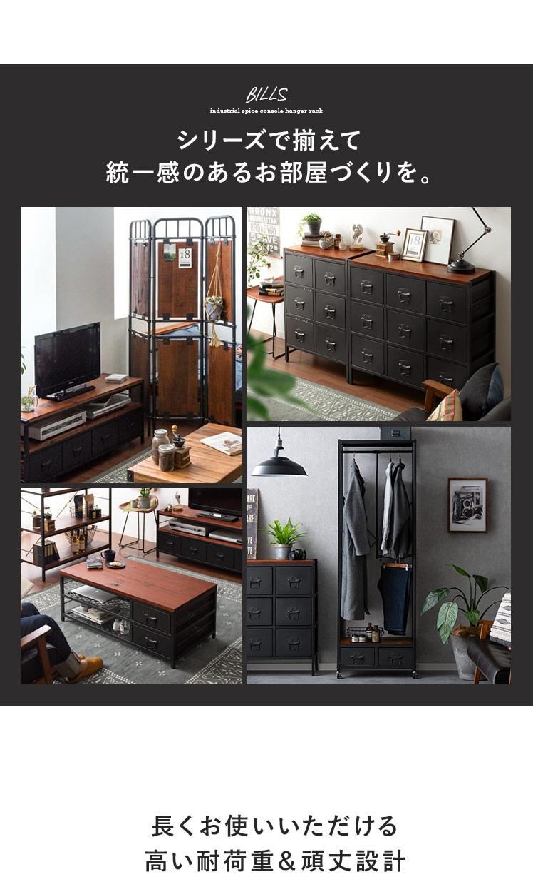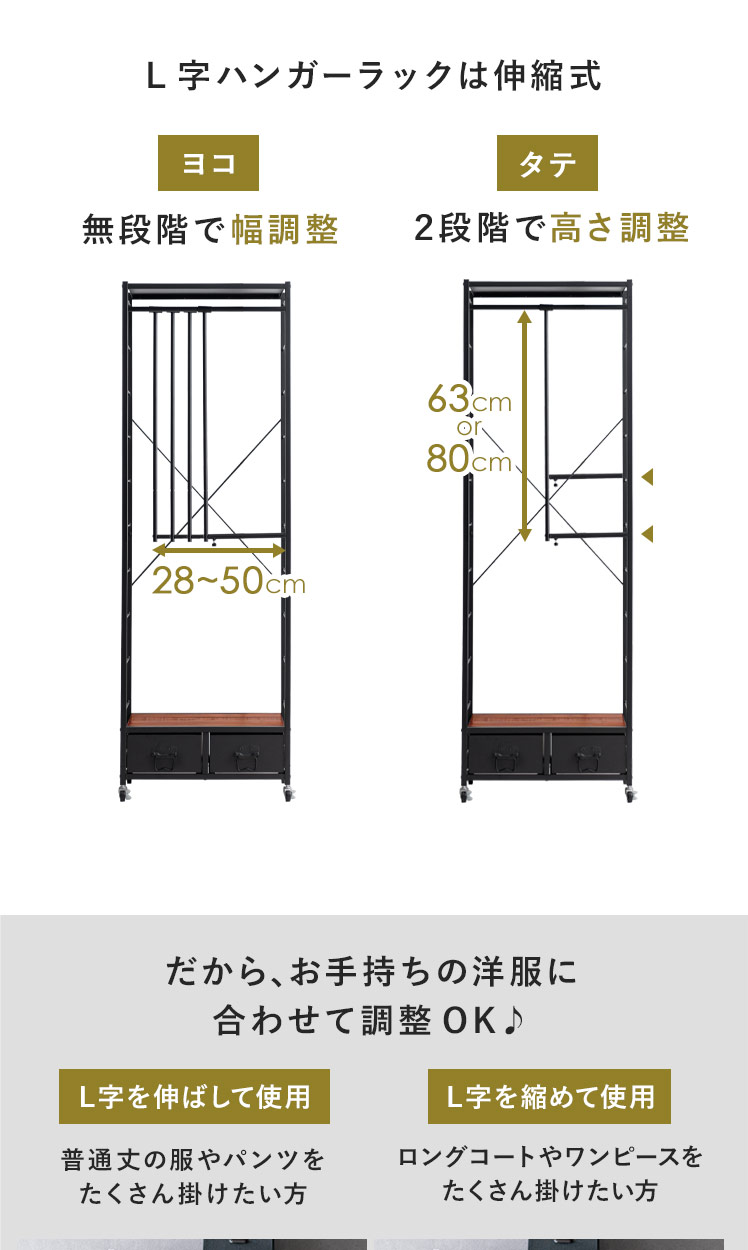 伸縮L字ハンガーラック BILLS〔ビルズ〕 60cm幅/空間にアクセントを作るヴィンテージデザインのハンガーラック。丈の長いコートだけでなく、伸縮して使えるL字型ハンガーで、普通丈の洋服やボトムスを2段で無駄なく収納していただけます。さらに2杯の引き出し付きで、靴下などの小物も収納可能。デザイン性と機能性を兼ね備えた理想のハンガーラックです。