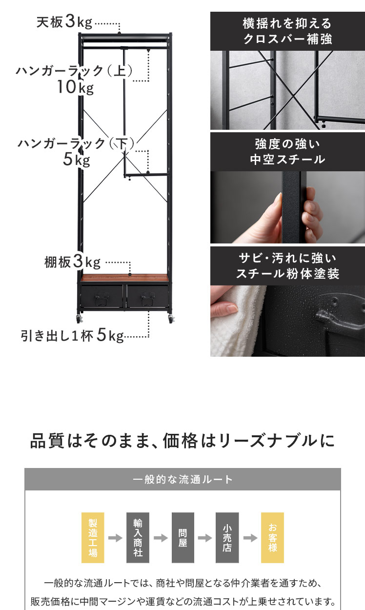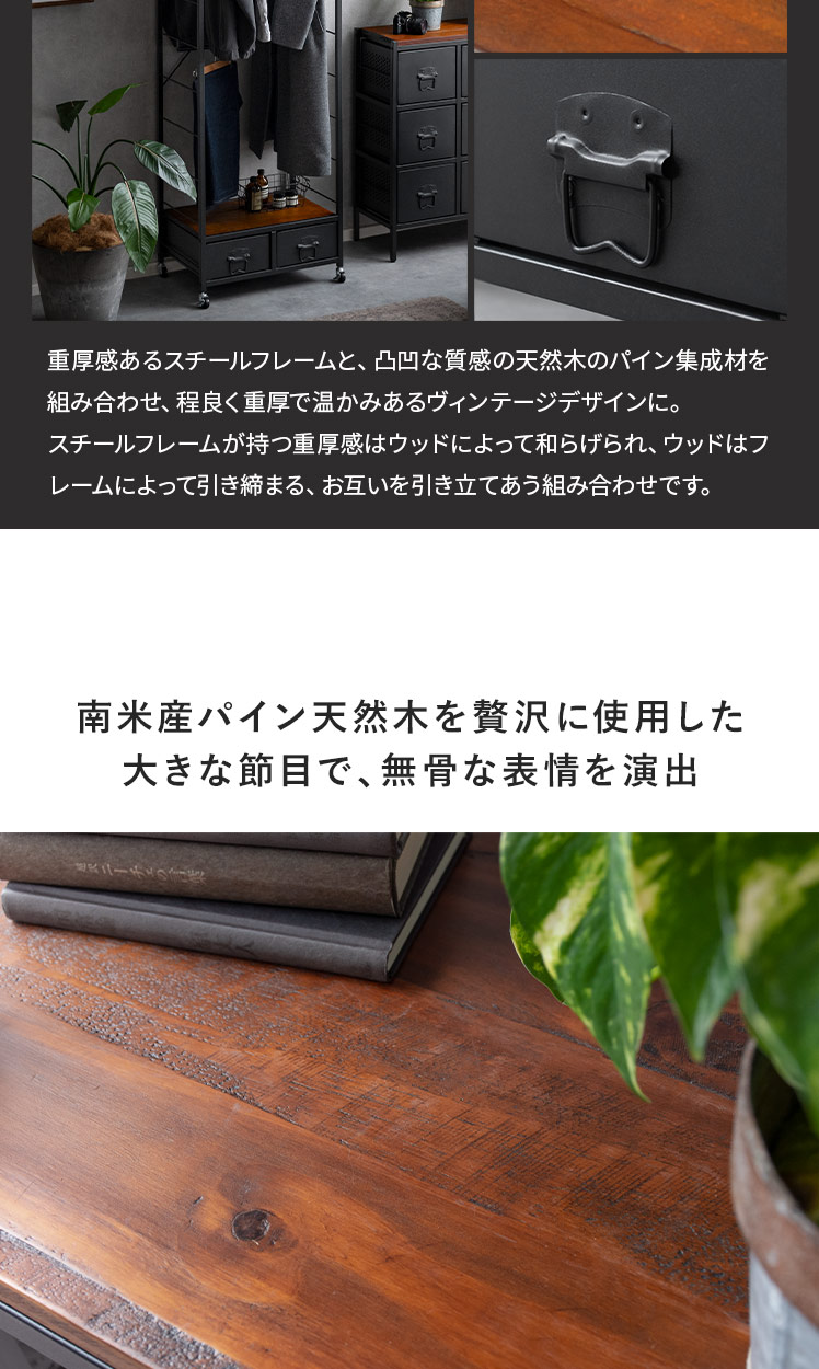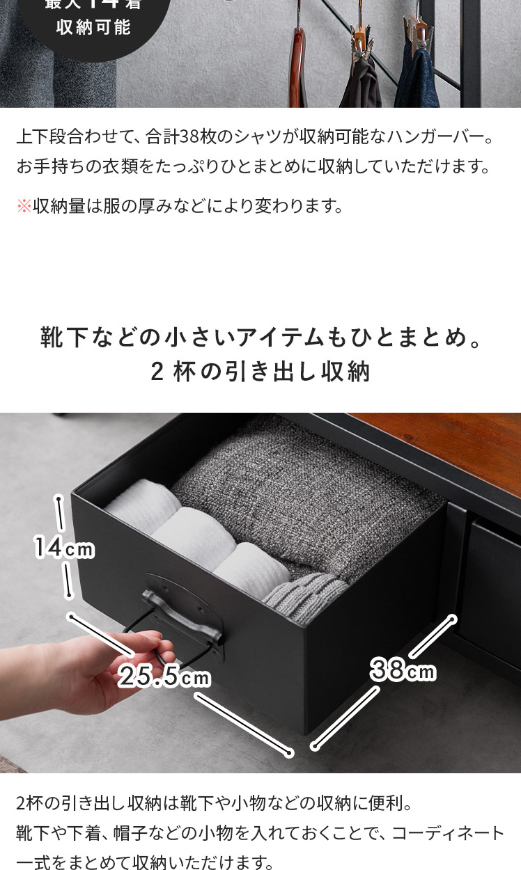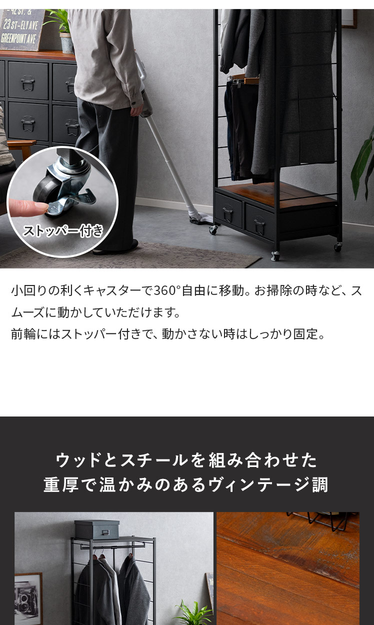 コートハンガー ワードローブ 伸縮可動式 マルチハンガーラック 衣類収納 引き出し付き 長さ調整 2段 ヴィンテージ ウッド 西海岸 ブルックリンブラック【5%OFFクーポン対象|公式なら毎日お得】